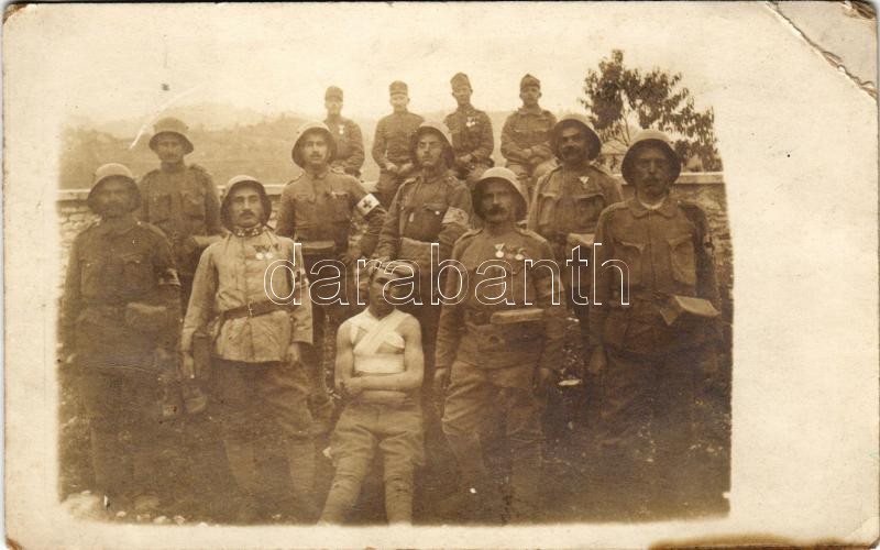 Első világháborús osztrák-magyar vöröskeresztes katonák rohamsisakban sebesült ellátás közben / WWI K.u.k. Austro-Hungarian military, Red Cross soldiers with injured soldier. photo (EB)