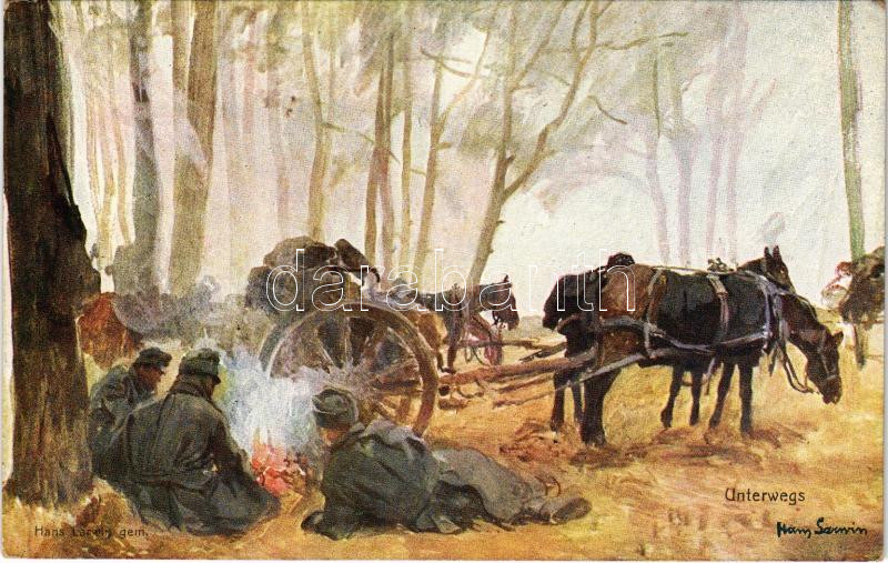 Unterwegs. Offizielle Karte für Rotes Kreuz, Kriegsfürsorgeamt Kriegshilfsbüro Nr. 396. / WWI Austro-Hungarian K.u.K. military, soldiers by the campfire s: Hans Larwin