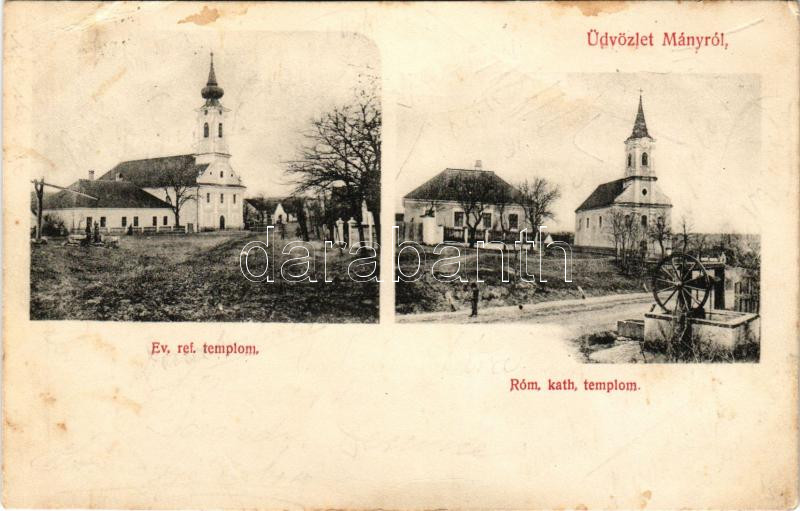 1907 Mány, Református és római katolikus templom, kerekes és gémes kút... https://www.darabanth.com/hu/473-Gyorsarveres/473.0/Kepeslapok/Magyarorszag~2000125/1907-Many-Reformatus-es-romai-katolikus-templom-kerekes-es-gemes-kut-Hollenzer-es-Okos-ki~II3208628