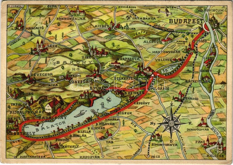 Balaton, térkép útvonallal Budapestről (EB) https://www.darabanth.com/hu/473-Gyorsarveres/473.0/Kepeslapok/Magyarorszag~2000125/Balaton-terkep-utvonallal-Budapestrol-EB~II3181990