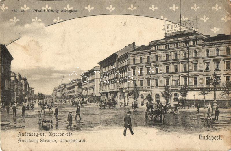 Leírás: Budapest VI. Andrássy út, Oktogon tér, Budapest Képes politikai napilap irodája, étterem, üzletek, Divald Károly 639. (kis szakadás / small tear)