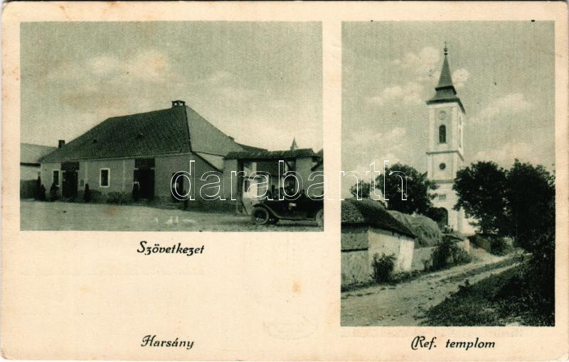 Leírás: Harsány (Miskolc), Református templom, automobil, Hangya szövetkezet üzlete és saját kiadása (EK)