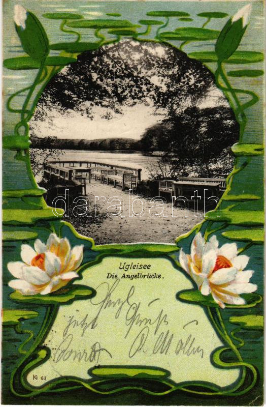 1900 Ukleisee, Ugleisee; Die Angelbrücke. Gasthaus zum Uglei am Uglei-See. August Holzbach, vorm. Director des Hotel Vosshaus in Eutin. Art Nouveau, floral, litho frame (fl)