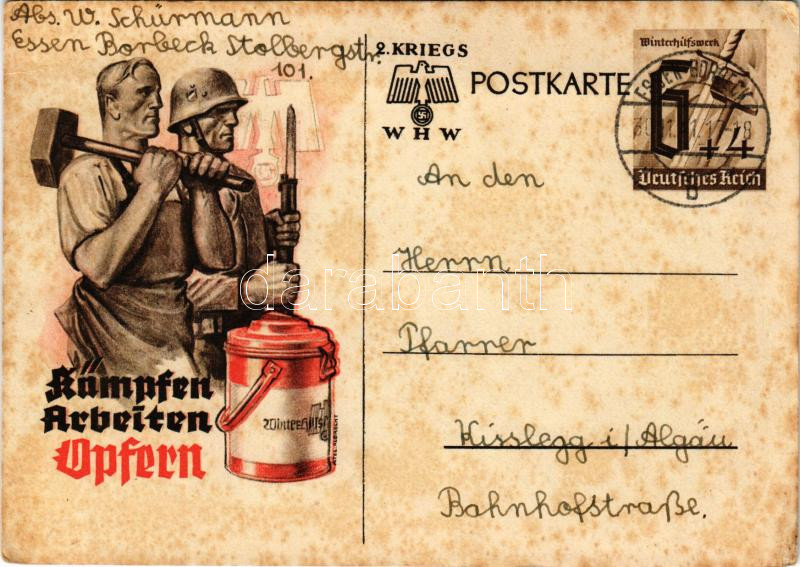 Leírás: 1941 Kämpfen Arbeiten Opfern. Winterhilfswerk 2. Kriegs WHW / "Fight, work, sacrifice" NSDAP German Nazi Party working class, labor propaganda, swastika; 6+4 Ga. s: Atel. Albrecht (fl)