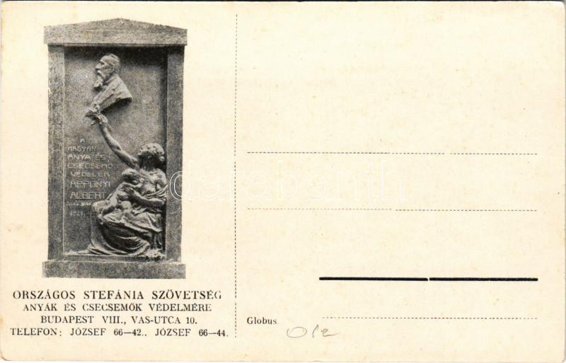 Budapest VIII. Országos Stefánia Szövetség 'Anyák és csecsemők vé... https://www.darabanth.com/hu/473-Gyorsarveres/473.0/Kepeslapok/Propaganda-politika~2000046/Budapest-VIII-Orszagos-Stefania-Szovetseg-Anyak-es-csecsemok-vedelmere-emlektabla-Appo~II3211758