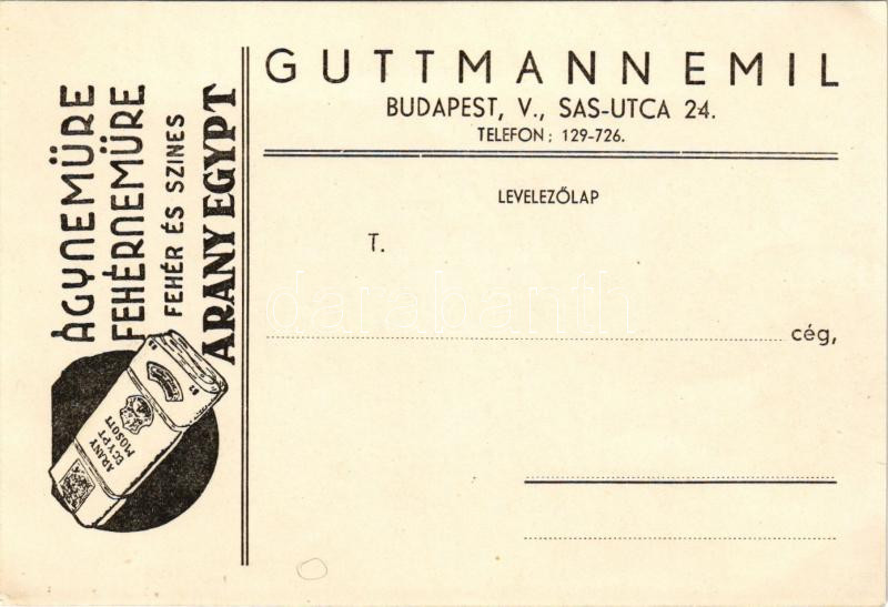 Ágyneműre, fehérneműre fehér és színes Arany Egypt. Guttmann Emil rekl... https://www.darabanth.com/hu/473-Gyorsarveres/473.0/Kepeslapok/Reklam~2000047/Agynemure-fehernemure-feher-es-szines-Arany-Egypt-Guttmann-Emil-reklamja-Budapest-Sas-ut~II3211786