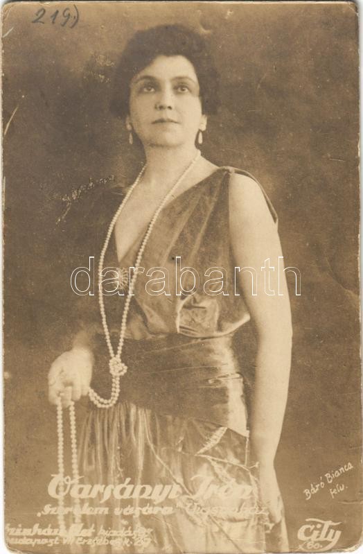 Leírás: Varsányi Irén "Szerelem vására" (Vígszínház) Báró Bianca felvétele. City photo (kopott sarkak / worn corners)