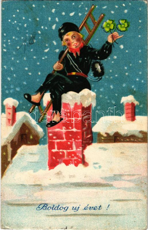 Boldog Újévet / New Year greeting art postcard with chimney sweeper an... https://www.darabanth.com/hu/473-Gyorsarveres/473.0/Kepeslapok/Udvozlolapok-Unnepek~2000057/Boldog-Ujevet-New-Year-greeting-art-postcard-with-chimney-sweeper-and-clovers-EK~II3210489