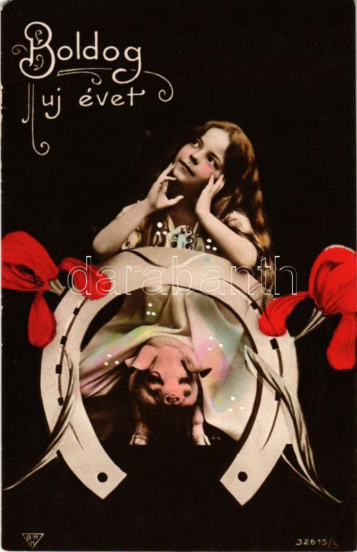 Boldog Újévet / New Year greeting art postcard with girl, pig and hors... https://www.darabanth.com/hu/473-Gyorsarveres/473.0/Kepeslapok/Udvozlolapok-Unnepek~2000057/Boldog-Ujevet-New-Year-greeting-art-postcard-with-girl-pig-and-horseshoe-EM~II3210491