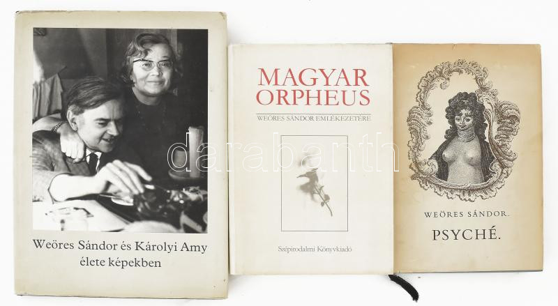 3 db Weöres Sándorral kapcsolatos könyv: Weöres Sándor: Psyché. Egy hajdani költőnő írásai. Bp., 1972, Magvető. Első kiadás. Kiadói egészvászon-kötés, kissé sérült kiadói papír védőborítóban. + Károlyi Amy: Weöres Sándor és Károlyi Amy élete képekben. Írta és összeáll.: - - . Bp., 1984, Magvető. Kiadói műbőr-kötés, helyenként kissé foltos lapokkal, kissé viseltes kiadói papír védőborítóban. + Magyar Orpheus. Weöres Sándor emlékezetére. Szerk.: Domokos Mátyás. Bp., 1990, Szépirodalmi Könyvkiadó. Kiadói kartonált papírkötés, kiadói papír védőborítóban.