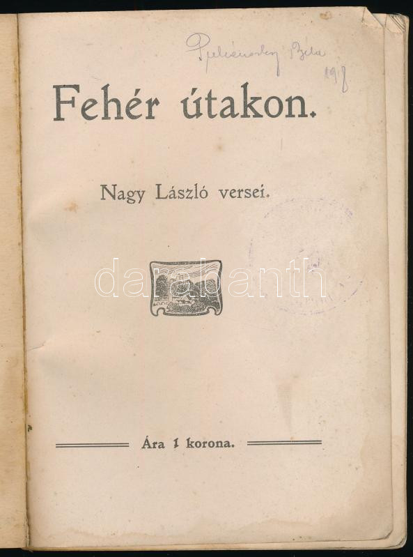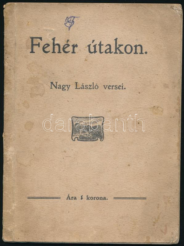 Fehér útakon. Nagy László versei. Kolozsvár, 1913. Szent Bonaventura könyvnyomda nyomása. Kiadói papírkötésben, bélyegzővel és tulajdonosi névbejegyzéssel.