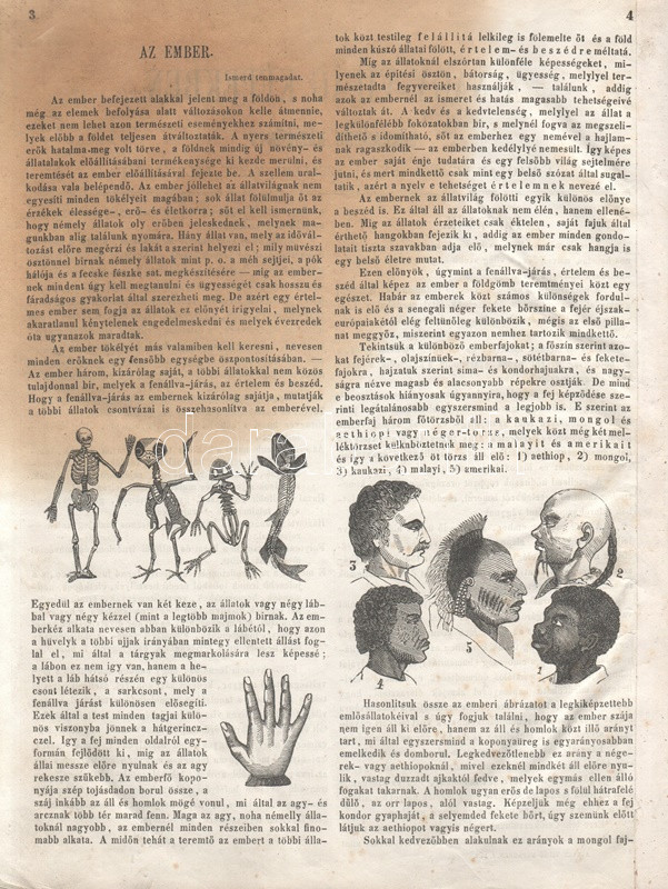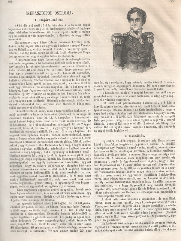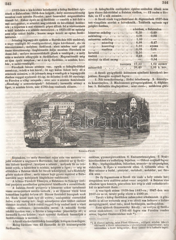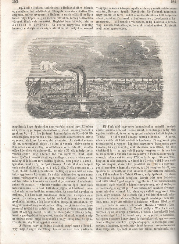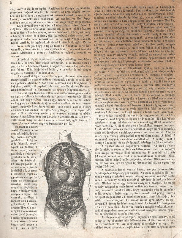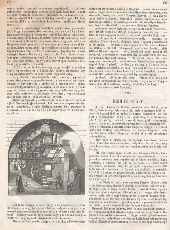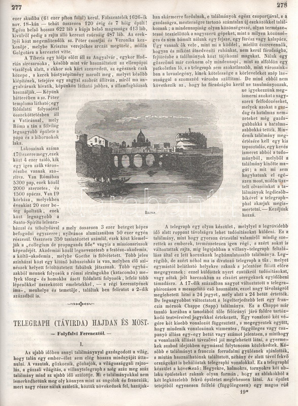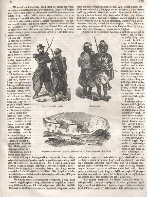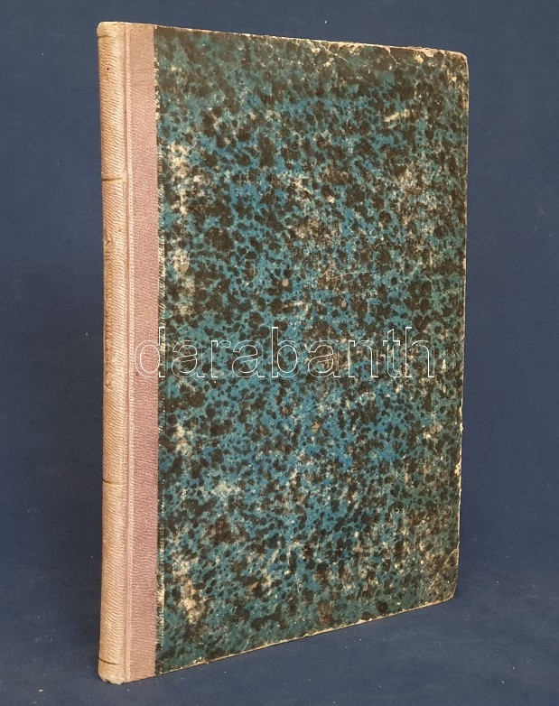 [Folyóirat] A nagy világ képekben. Közhasznu házikönyv, a magyar nemzet anyagi, szellemi javára. Kiadja és szerkeszti: Vahot Imre. I. évfolyam, 1-5. szám. [Egybekötve.] [Pest, 1855. Emich Gusztáv könyvnyomdája.] 368 hasáb. Vahot Imre (1820-1879), drámaíró, lapszerkesztő, a szabadságharc előtti és utáni idők sajtóvállalkozójának egy évfolyamot (hat lapszámot) megért népies ismeretterjesztő folyóirata, néprajzi, földrajzi, honismereti, történelmi, természettudományi, mezőgazdasági, vadászati és szépirodalmi írásokkal, oldalszámozáson belül gazdag szövegközti illusztrációs anyaggal. A Bach-korszakban felállt folyóirat érhető módon nélkülözi a belpolitikai híreket - a rendszertelen időközönként való megjelenés amúgy sem kedvez a belpolitikai híradásoknak - a jelentős érdeklődésre számot tartó krími háború fejleményeit ugyanakkor hosszasan ecseteli. A tartalomból: Programm - Jenevay László: A cserkesznép és prófétája - Erdélyi János: Világszép János királyfi (tündérmese) - Mákonypipázók Syngaporeban - Vahot Imre: A magyar írók segélypénztára ügyében - Körmendy Sándor: Kaposvár (honismereti cikk) - Tompa Mihály portréja - Dienes Lajos: A nyomdászat, a sajtó ismertetése - A Krím-félsziget. Szebasztopol ostroma - Annák József: Kőszén és kőszénbányák hazánkban - Környei: Eszkimo és hazája - Szilágyi Virgil: Magellan és a Föld első körülutazása - Legújabb gazdasági eszközök, gépek: Túró-eke a lenmíveléshez. Gabna-, mag-, fű-, gyökér-, gyümölcs- és főzelék-szárító kemencze. Új borlopó - Jellemrajzok a madárvilágból - Tigris-vadászat - A vidéki színházak Francziaországban - Új-York - Vahot Imre: Erdélyi régiségek: Dózsa György vaskoronája. Kolozsvár régi kapukulcsa - Környei: A természettudományok erkölcsi hatása - A kretinek vagy golyhók a türingeni erdőben - Folyfalvi Ferencz: Telegraph (távirda) hajdan és most - Jenevay László: Trencsén (honismereti cikk) - Japán szokások - Európának viszonyai Japánnal - Az északamerikaiak Japánban - Jenevay László: A Balatonvidék és Füred (honismereti cikk) - Legújabb párisi divat és valami a divatról - Lisznyai Kálmán: Patikárius Ferkóhoz. Gyűjteményünk a folyóirat első öt számát tartalmazza. Kéthasábos szövegoldalakkal. Az első öt ív levelein halvány foltosság, a kötet elején két levél és a kötetzáró négy utolsó levél fűzése a gerincnél megerősítve. Lakatos 1924. Aranyozott gerincű korabeli félvászon kötésben. Jó példány.