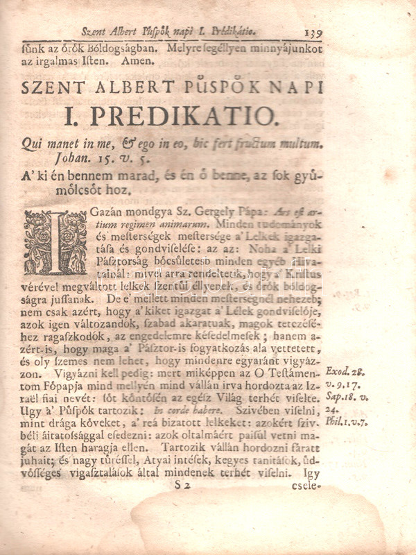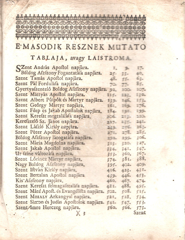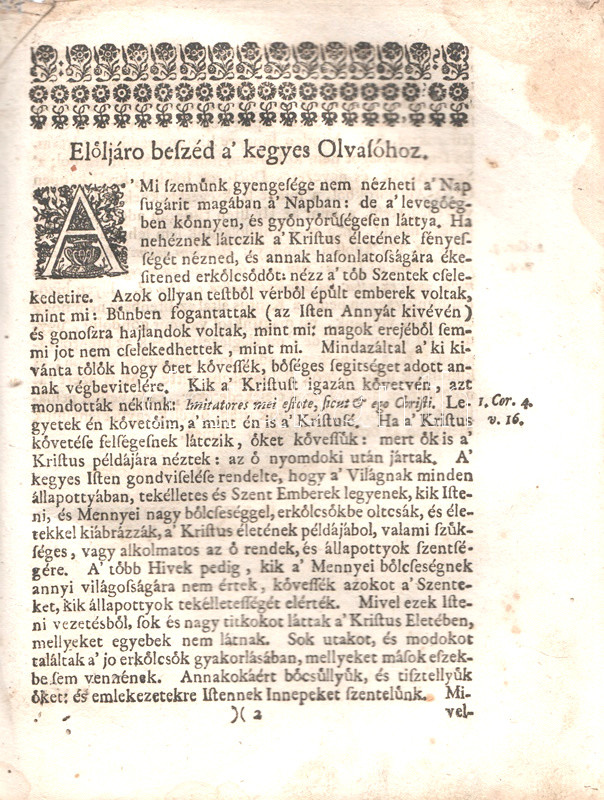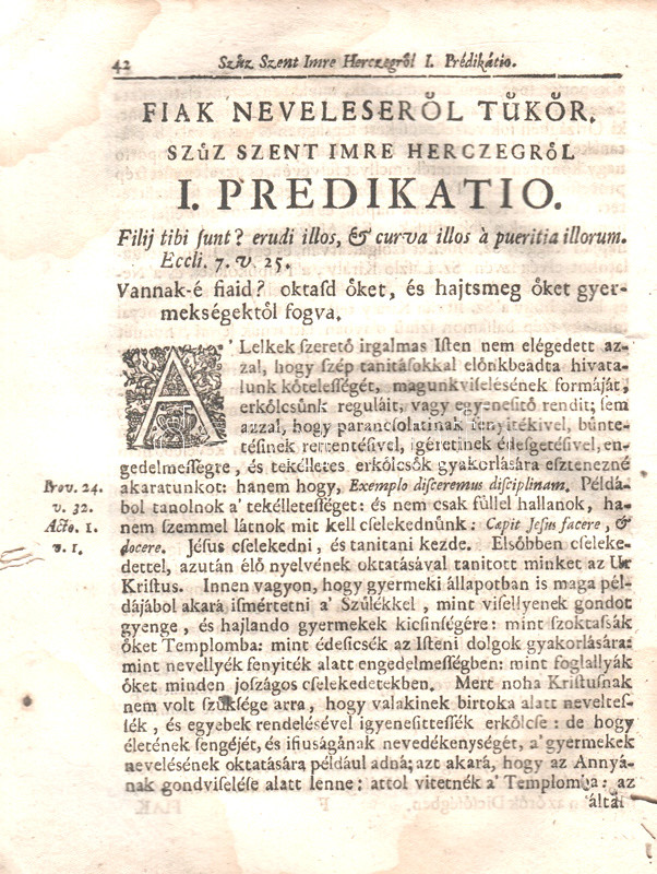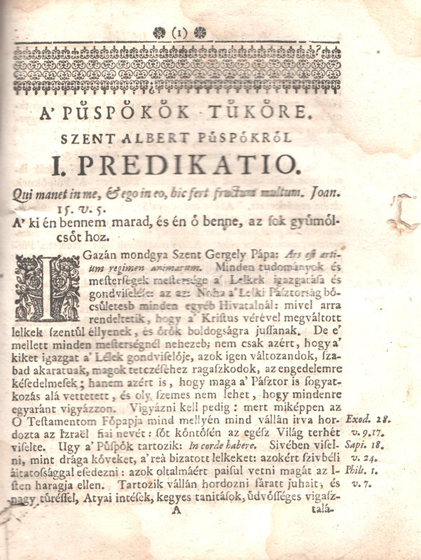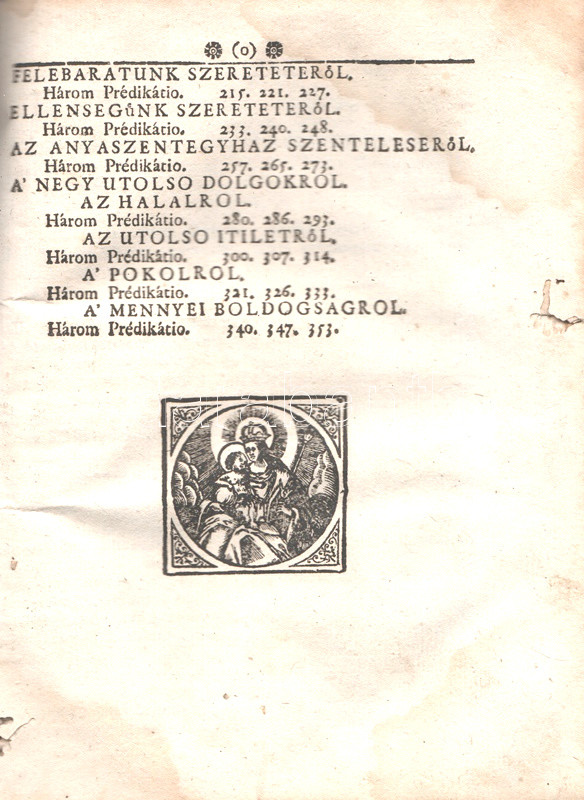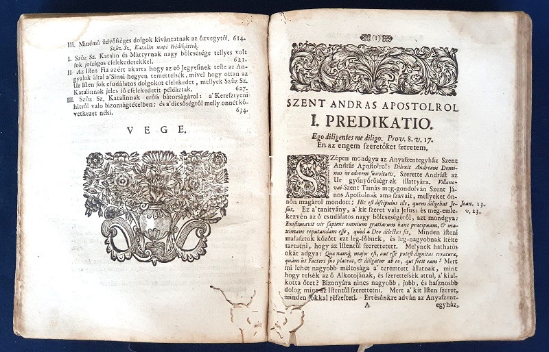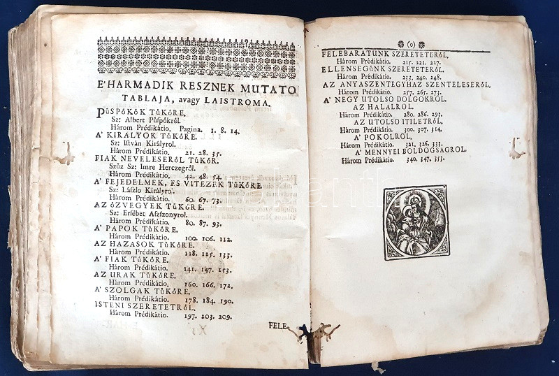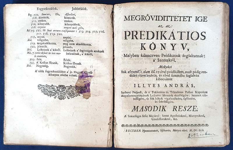 Illyés András: Megrövidittetet Ige az-az: Predikatios Könyv I-III. rész. [Egybekötve.] Elsö reszsze: Melyben hetven négy Prédikátiok foglaltatnak, mellyekben az igaz hit fö agazatinak nagy titkai, a Szent Atyák által megmagyaráztatnak, és szép üdvösséges tanuságok adatnak. Mellyeket sok esztendök alatt élö nyelvel prédikállott, most pedig rendesen öszveszedvén, rövid summában foglalván, és meg irván ki bocsátott. Illyés András, szebeni praepost. - Második resze: Melyben kilenczven Prédikátiok foglaltatnak: [...] A' Szentséges Szüz Máriáról: Szent Apostolokrol, Mártyrokrol, Confessorokrol, &c. - Harmadik resze: Melyben ötvennégy Prédikátiok foglaltatnak, Minden renden, és allapotban lévö keresztyén embereknek hármas tükört adván elejekbe. Nagyszombatban és Bécsben, 1691-1692. Nyomtattatott Nagy-Szombatban az Academiaj Bötükkel, Friedl János által és Bécsben Sischowitz Máttyás által. [11]-552 (helyesen 550) + [6] p.; [16] + 640 + [2] p.; [10] + 296 p. Első kiadás. Illyés András (1637-1712) katolikus pap, erdélyi kanonok, egyházi író, hitszónok, műfordító, 1696-tól erdélyi püspök. A latin és magyar nyelven alkotó Illyés rendkívül termékeny szerzőnek számít: hitmélyítő prédikációgyűjteménye előszavában huszonnyolcadik munkájaként hivatkozik éppen aktuális kötetére, melyhez a következő évben csatlakozott a második és harmadik rész. Az évtizedes prédikációs gyakorlatból származó három, összetartozó munka első része az egyházi év menete szerinti prédikációkat tartalmaz, a második rész a szentek, apostolok, mártírok és hitvallók működése nyomán készült igehirdetéseket, a harmadik rész pedig püspökök, királyok, fiatalok, urak és szolgák erkölcsi tüköreként szorgalmazza a hívők jó magaviseletét, hitbuzgalmát és társadalmi rendbe való illeszkedését. A második és harmadik rész bőségesen szolgál hazai példákkal is, Szent László és Szent István király, illetve Szent Imre herceg életpéldái nyomán. Kolligátumunk első művének címlevele és az azt követő hét levele, az első mű belívének további két levele, a harmadik mű címlevele, valamint utolsó 35 levele hiányzik (az utolsó mű [12] + 359 + [7] oldalban teljes). Példányunk hét levelén felül apró pótlás, számos oldalán, különösen a munkák első ívein a lapszéleken és sarkokban halvány foltosság, számos levélen enyhe foxing, kisebb foltosság, illetve apró szúrágásnyom. Példányunk fűzése a kolligátum utolsó leveleinél enyhén laza, az első és utolsó levélen szakadás, sérülés, az első két ív levelein gyűrődés. RMK 1415, 1416, 1417. Fűzve, kötéstábla nélkül.