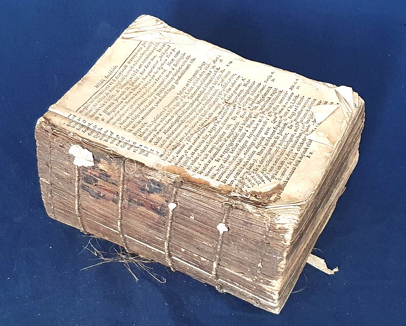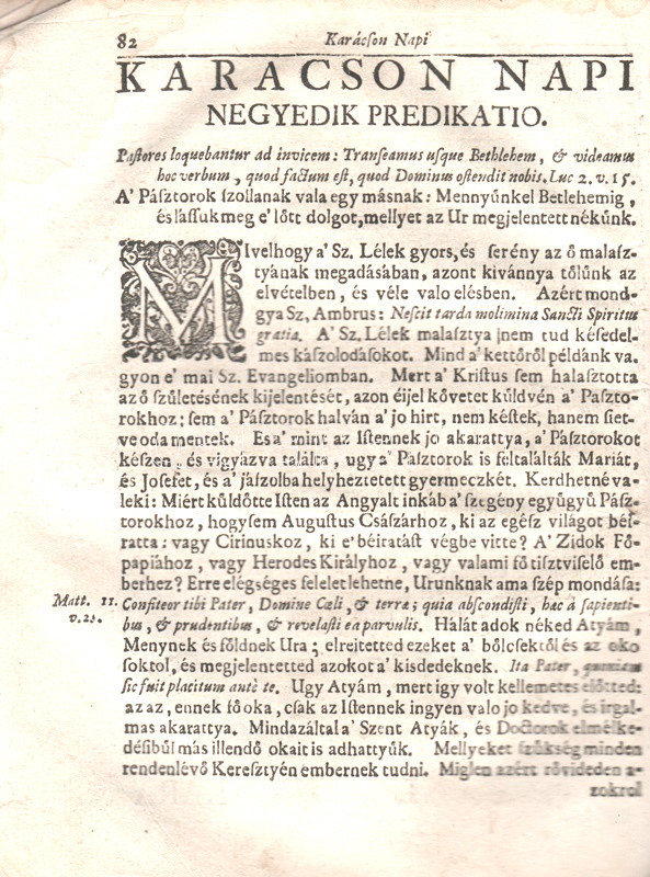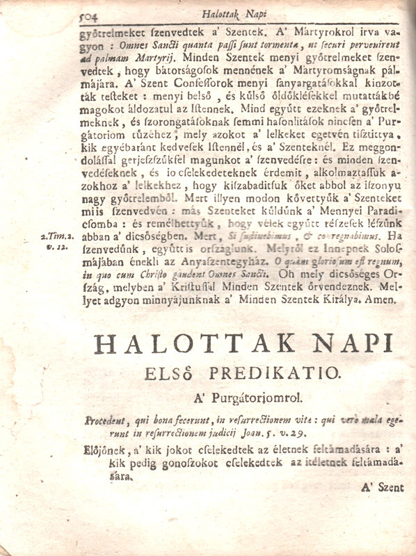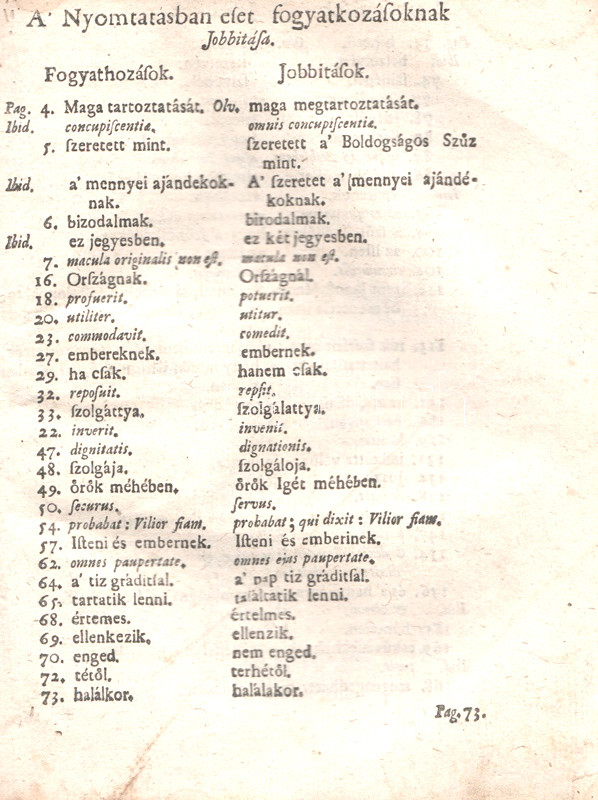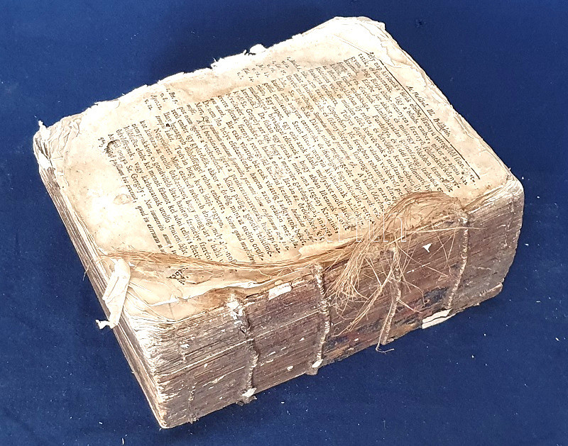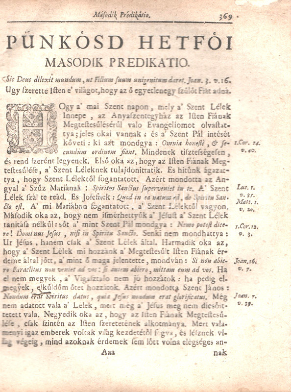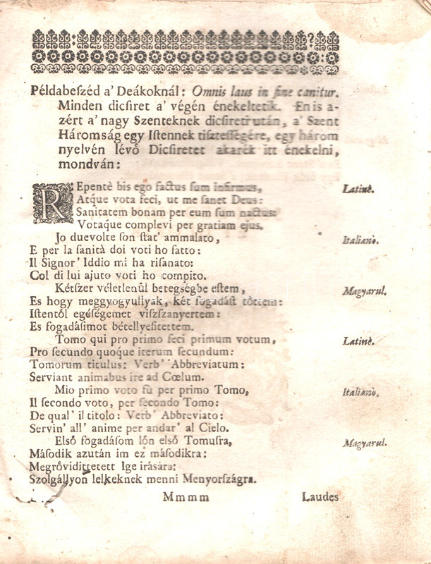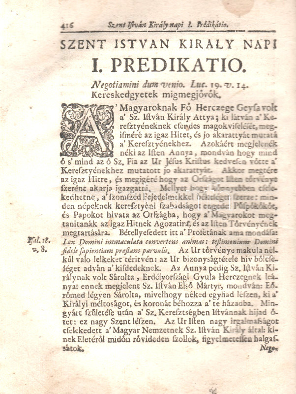 Illyés András: Megrövidittetet Ige az-az: Predikatios Könyv I-III. rész. [Egybekötve.] Elsö reszsze: Melyben hetven négy Prédikátiok foglaltatnak, mellyekben az igaz hit fö agazatinak nagy titkai, a Szent Atyák által megmagyaráztatnak, és szép üdvösséges tanuságok adatnak. Mellyeket sok esztendök alatt élö nyelvel prédikállott, most pedig rendesen öszveszedvén, rövid summában foglalván, és meg irván ki bocsátott. Illyés András, szebeni praepost. - Második resze: Melyben kilenczven Prédikátiok foglaltatnak: [...] A' Szentséges Szüz Máriáról: Szent Apostolokrol, Mártyrokrol, Confessorokrol, &c. - Harmadik resze: Melyben ötvennégy Prédikátiok foglaltatnak, Minden renden, és allapotban lévö keresztyén embereknek hármas tükört adván elejekbe. Nagyszombatban és Bécsben, 1691-1692. Nyomtattatott Nagy-Szombatban az Academiaj Bötükkel, Friedl János által és Bécsben Sischowitz Máttyás által. [11]-552 (helyesen 550) + [6] p.; [16] + 640 + [2] p.; [10] + 296 p. Első kiadás. Illyés András (1637-1712) katolikus pap, erdélyi kanonok, egyházi író, hitszónok, műfordító, 1696-tól erdélyi püspök. A latin és magyar nyelven alkotó Illyés rendkívül termékeny szerzőnek számít: hitmélyítő prédikációgyűjteménye előszavában huszonnyolcadik munkájaként hivatkozik éppen aktuális kötetére, melyhez a következő évben csatlakozott a második és harmadik rész. Az évtizedes prédikációs gyakorlatból származó három, összetartozó munka első része az egyházi év menete szerinti prédikációkat tartalmaz, a második rész a szentek, apostolok, mártírok és hitvallók működése nyomán készült igehirdetéseket, a harmadik rész pedig püspökök, királyok, fiatalok, urak és szolgák erkölcsi tüköreként szorgalmazza a hívők jó magaviseletét, hitbuzgalmát és társadalmi rendbe való illeszkedését. A második és harmadik rész bőségesen szolgál hazai példákkal is, Szent László és Szent István király, illetve Szent Imre herceg életpéldái nyomán. Kolligátumunk első művének címlevele és az azt követő hét levele, az első mű belívének további két levele, a harmadik mű címlevele, valamint utolsó 35 levele hiányzik (az utolsó mű [12] + 359 + [7] oldalban teljes). Példányunk hét levelén felül apró pótlás, számos oldalán, különösen a munkák első ívein a lapszéleken és sarkokban halvány foltosság, számos levélen enyhe foxing, kisebb foltosság, illetve apró szúrágásnyom. Példányunk fűzése a kolligátum utolsó leveleinél enyhén laza, az első és utolsó levélen szakadás, sérülés, az első két ív levelein gyűrődés. RMK 1415, 1416, 1417. Fűzve, kötéstábla nélkül.
