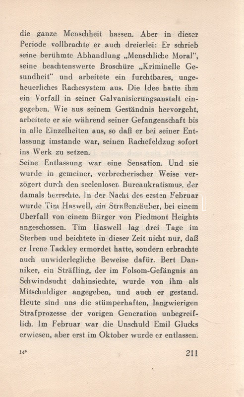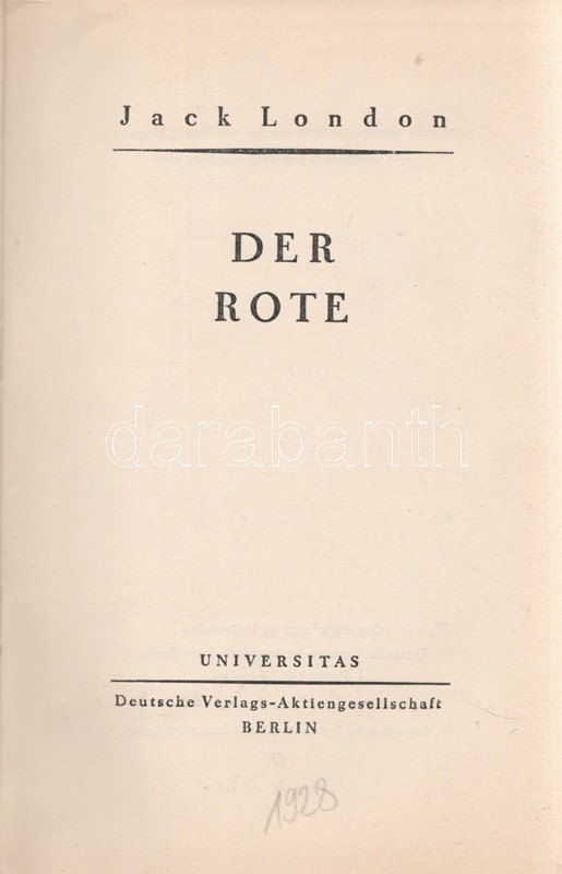 Jack London: Der Rote. Einzig berechtigte Übersetzung von Erwin Magnus. [Elbeszélések.] Berlin, (1928). Universitas Deutsche Verlags-Aktiengesellschaft (Gedruckt in der Buchdruckwerkstätte GmbH.) 260 + [4] p. Első német kiadás. Jack London (1876-1916) amerikai író novellatermése nagyrészt három-négy téma körül csoportosul: alaszkai történetekre, kaliforniai csavargótörténetekre, délszaki történetekre, illetve tudományos-fantasztikus elbeszélésekre osztható. Gyűjteményünk az eredeti nyelven 1918-ben - a szerző halála után - ,,The Red One" címen megjelent, jobbára tudományos-fantasztikus történeteket közreadó kötet első teljes német kötetkiadása. A címlap verzóján régi tulajdonosi bejegyzés, az első előzéken kereskedői könyvjegy. (Das gesamte Werk Jack Londons.) Aranyozott kiadói egészvászon kötésben, felül színes festésű lapszélekkel, színes, illusztrált, sérült, javított kiadói védőborítóban. Jó példány.