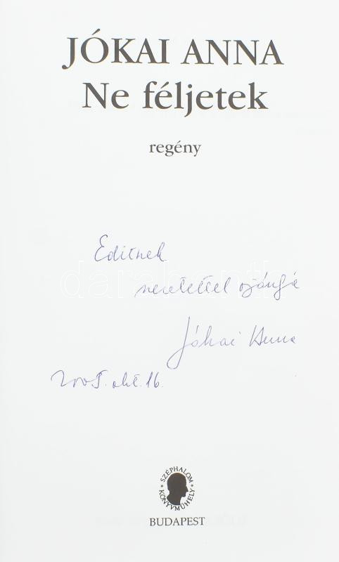 Jókai Anna: Ne féljetek. (Dedikált!) Bp., 2005, Széphalom Könyvműhely. Kiadói kartonált papírkötés. A szerző, Jókai Anna (1932-2017), a Nemzet Művésze címmel kitüntetett, kétszeres Kossuth-díjas és József Attila-díjas író- és költőnő által dedikált példány.