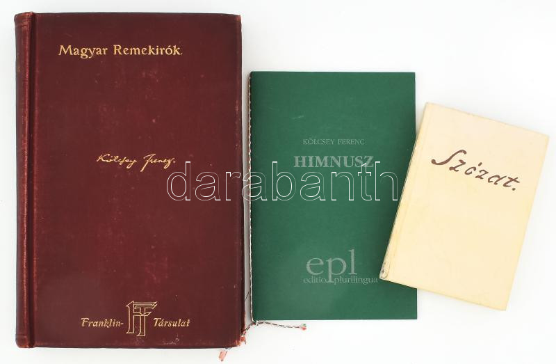Leírás: Kölcsey Ferencz munkái. Sajtó alá rend. és bevezetéssel ellátta: Angyal Dávid. Magyar Remekírók 14. köt. Bp., 1903, Franklin-Társulat, 320 p. Kiadói aranyozott egészvászon-kötés, kissé kopottas borítóval, helyenként foltos lapokkal. + Kölcsey Ferenc: Himnusz. Bp., 2002, Serdián Kft. Kétnyelvű (magyar-olasz). Kiadói zsinórfűzéses papírkötés. + Vörösmarty - Egressy: Szózat. A gondolattól a világhírig. (Minikönyv). Bp., 1988, Hazafias Népfront. Kiadói műbőr-kötés.