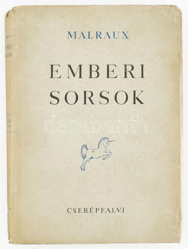 Leírás: Malraux, André: Emberi sorsok. Bp., 1945, Cserépfalvi, 356 p. Kiadói papírkötés, kissé viseltes állapotban, az utolsó lapon beragasztott bélyegekkel.