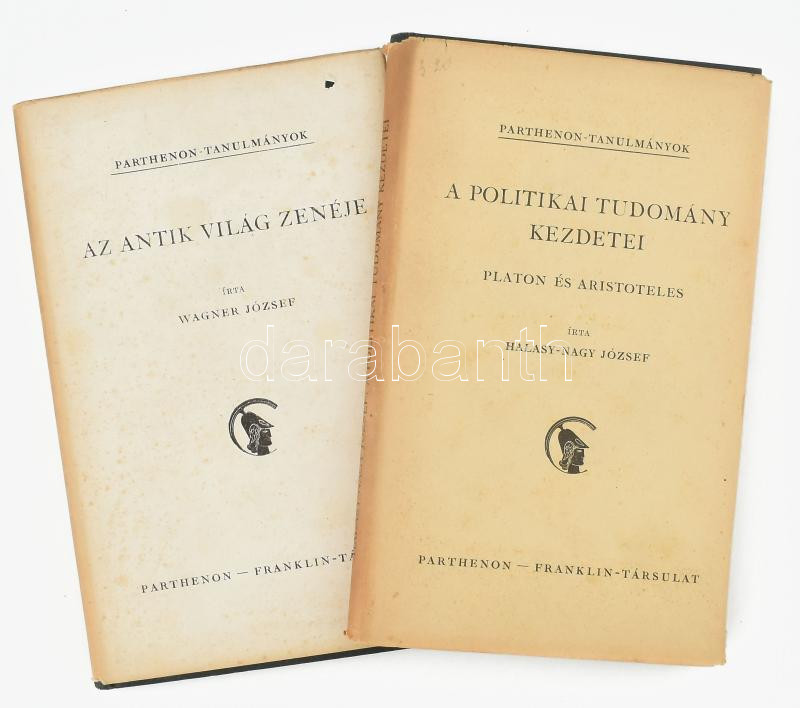 Parthenon-tanulmányok sorozat 2 kötete: Halasy-Nagy József: A politikai tudomány kezdetei. Platon és Aristoteles. Parthenon-tanulmányok 1. (Bp.), 1942, Parthenon (Franklin-ny.), 93+(3) p. Kiadói egészvászon-kötés, jó állapotban, kissé szakadt kiadói papír védőborítóban. + Wagner József: Az antik világ zenéje. Parthenon-tanulmányok 6. (Bp.), 1943, Parthenon (Franklin-ny.), 93+(3) p. Kiadói egészvászon-kötés, jó állapotban, kissé foltos kiadói papír védőborítóban.