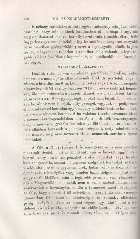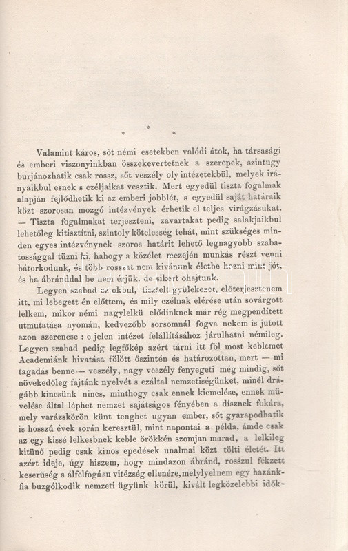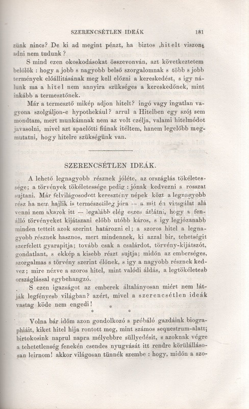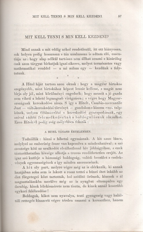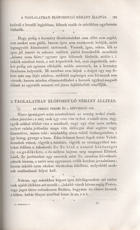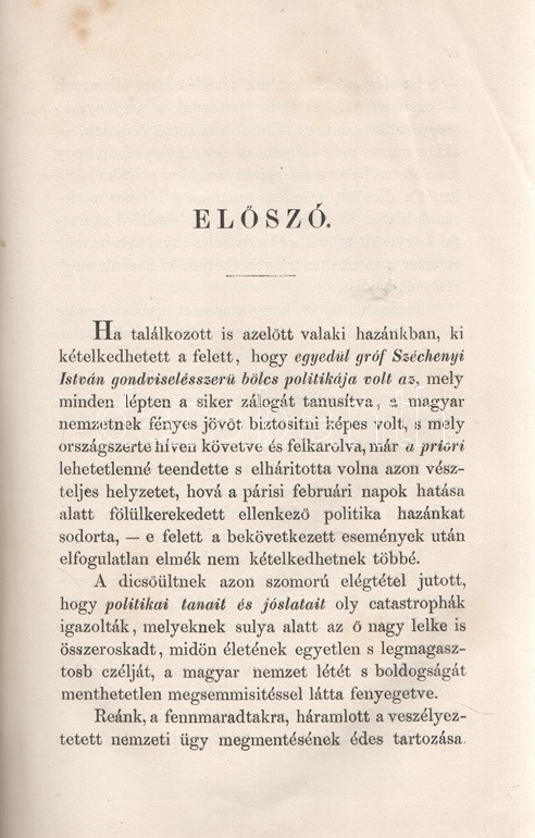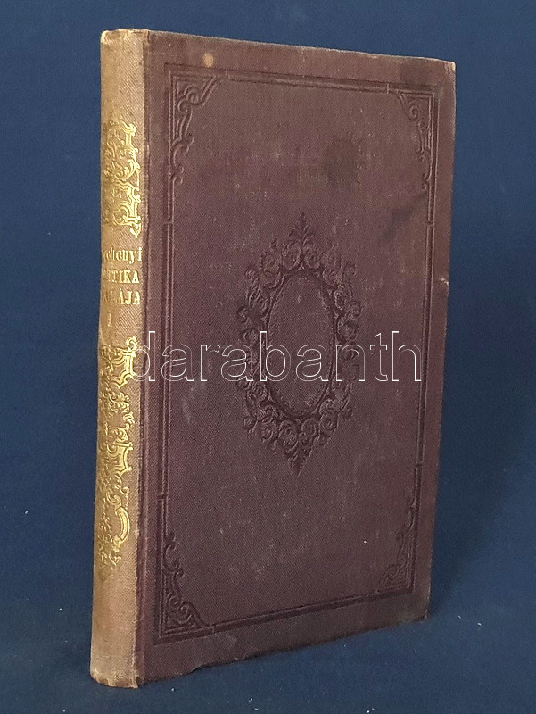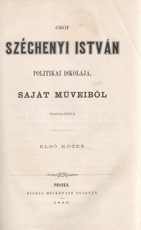 Széchenyi István: Gróf Széchenyi István: politikai iskolája, saját műveiből összeállítva. Első kötet. Pesten, 1863. Kiadja Heckenast Gusztáv (Nyomatott Landerer és Heckenastnál.) [4] + VI + 386 + [2] p. A Török János szerkesztésében három kötetben megjelenő Széchenyi-kiadás azzal az indoklással jelent meg, miszerint Széchenyi alapvető dolgozatai a könyvpiacon már elérhetetlenek, és a közgazdasági gondolkodás megreformálása érdekében olcsó kiadásban kell hozzáférhetővé tenni a megdicsőült államférfi politikai hagyatékát. Az első kötet a ,,Hitel", a ,,Világ", a ,,Stadium" és ,,A magyar Academia körül" című dolgozatokat adja közre, szemelvényes formában. Gyulai Pál, a korszak vitriolos nyelvű kritikusa a ,,Koszorú" című hetilapban szemlézte az első kötetet, és a jó szándék elismerése mellett kétségbe vonta a szemelvényes formátum pedagógiai értékét, minthogy a gondolatmenet csakis csonkítatlan formában értékelhető (és közölhető) Széchenyi-műként. A munka második és harmadik kötete 1863-1864 során jelent meg. Szentkirályi 305. Díszesen aranyozott gerincű, vaknyomásos korabeli egészvászon kötésben, pávamintás festésű lapszélekkel. Jó példány.