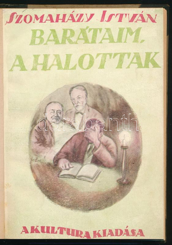 Szomaházy István: Barátaim, a halottak. Bp., 1920, Kultura, 2 sztl. lev.+ 150+(2) p. Első kiadás. A könyvdíszeket Szántó Lajos rajzolta. Átkötött félvászon-kötésben, az eredeti elülső papírborító bekötve, ex libris-szel, tulajdonosi és intézményi bélyegzőkkel. Számozatlan példány.