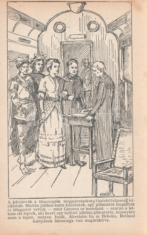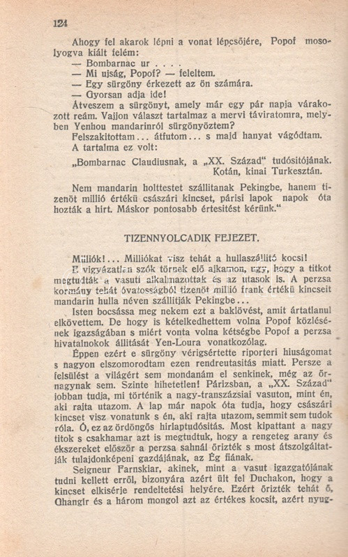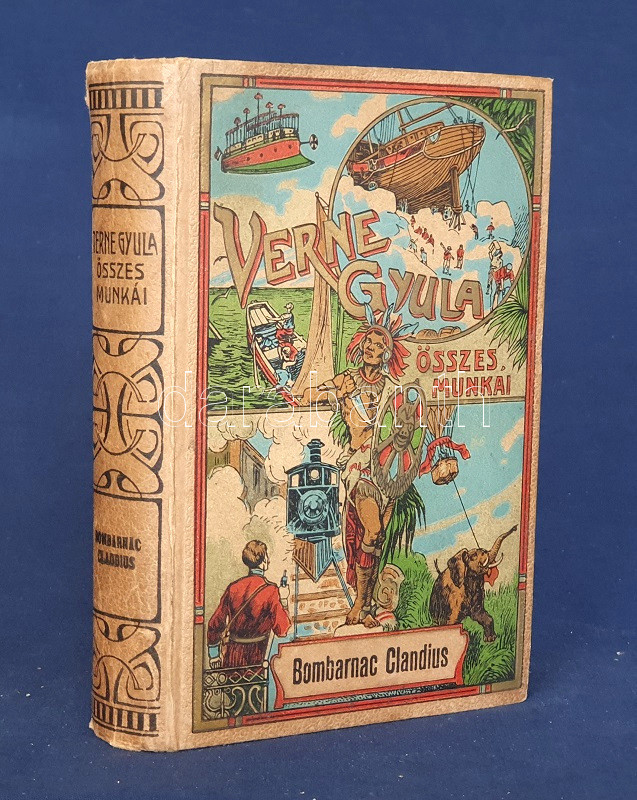 Verne, [Jules] Gyula: Bombarnac Claudius. Egy riporter jegyzÅ‘könyve. FordÃtotta Bányai Elemér. VedrÅ‘di István rajzaival. Budapest, (1900 körül). Magyar Kereskedelmi Közlöny HÃrlap- és Könyvkiadóvállalat (Tolnai Nyomdai Műintézet Rt.) 1 t. (cÃmkép) + 187 + [1] p. Verne Gyula (1828-1905) válogatott európai és ázsiai hÅ‘söket és kÃnai gonosztevÅ‘ket felvonultató vasúti kalandregénye eredeti nyelven elÅ‘ször folyóirat-folytatásokban, majd 1892-ben kötet alakjában jelent meg, ,,Claudius Bombarnac" cÃmen. A regény cselekménye a Kaszpi-tengertÅ‘l Pekingig húzódó vasúton megtörtént kalandokat jelenetezi, ál-holttesttel, pénzcsempészettel és kÃnai banditákkal, szokatlan módon a nem a helyzet magaslatán álló riporter elbeszélÅ‘i pozÃciójából. A regény elsÅ‘ magyar kiadása Huszár Imre fordÃtásában jelent meg (Franklin, 1894), a francia eredetibÅ‘l származó 54 képpel. E képes kiadással versenyzett a századfordulón a Magyar Kereskedelmi Közlöny könyvkiadója által kibocsátott, illusztrált Bányai Elemér-fordÃtás, oldalszámozáson belül VedrÅ‘di István tÃz egész oldalas rajzával. A két Bombarnac-fordÃtáshoz 1907-tÅ‘l csatlakozott a Zempléni P. Gyula-féle fordÃtás, Vas József kiadásában. Aranyozott, szÃnes, illusztrált, vaknyomásos kiadói kartonkötésben. Jó példány.