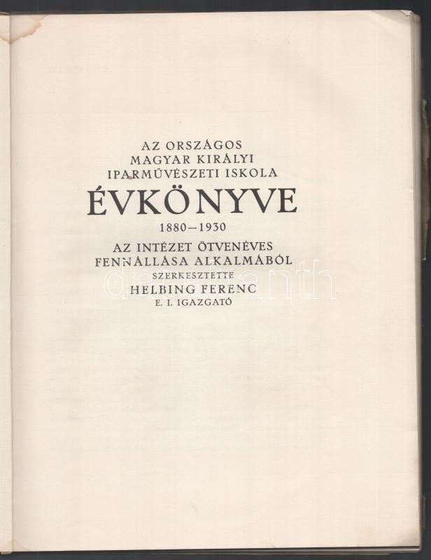 Az Országos Magyar Királyi Iparművészeti Iskola Évkönyve 1880-1930. Az intézet ötvenéves fennállása alkalmából. Szerk.: Helbing Ferenc. Bp., Kir. M. Egyetemi Nyomda. Gazdag képanyaggal illusztrálva. Kiadói papírkötés, sérült gerinccel, foltos és kissé sérült borítóval, utolsó néhány lap felső sarkában ázásnyommal, egy lapon lapszéli tollas jelöléssel.