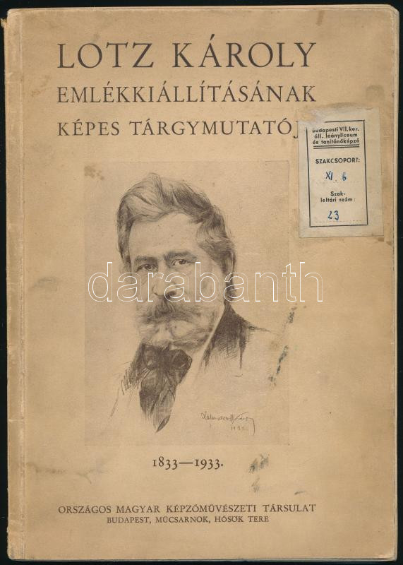 Lotz Károly emlékkiállításának képes tárgymutatója 1833-1933. Ifj. Wlassics Gyula báró előszavával. Bp., 1933, Országos Magyar Képzőművészeti Társulat, 32 p.+ 24 (kétoldalas) t. Fekete-fehér reprodukciókkal illusztrálva. Kiadói papírkötés, kissé viseltes, koszos borítóval, régi intézményi bélyegzőkkel, ajándékozási bejegyzéssel.