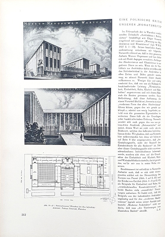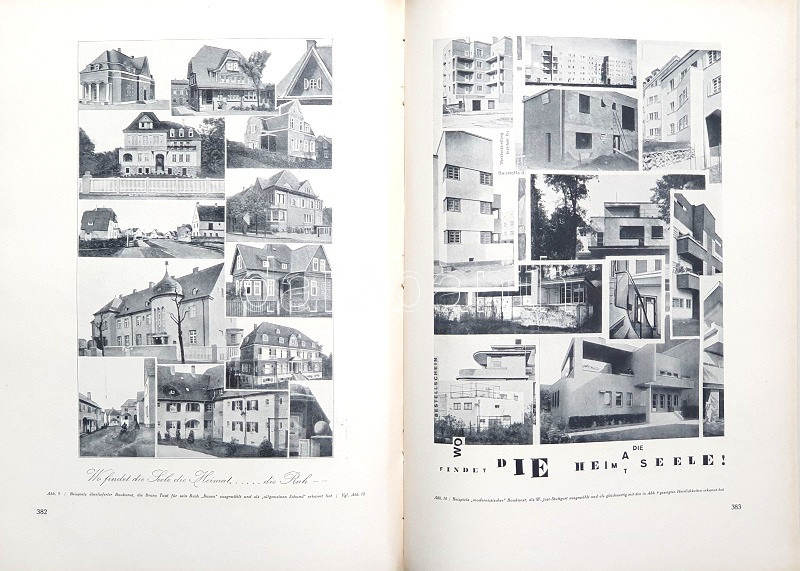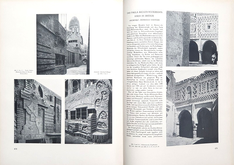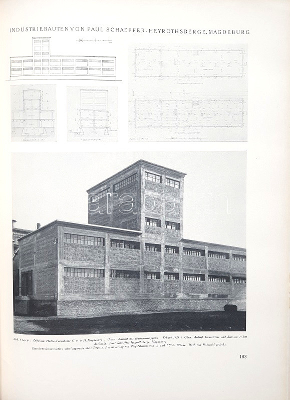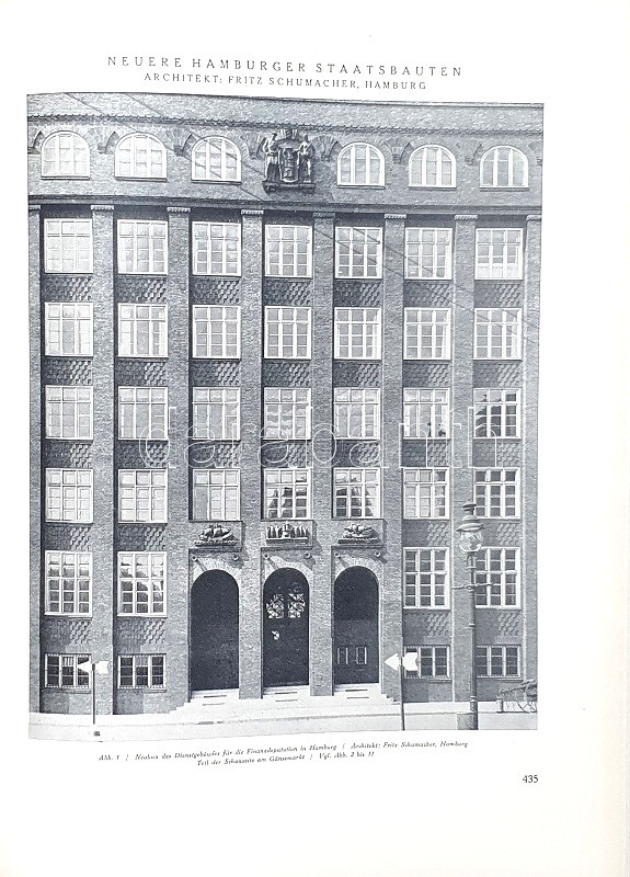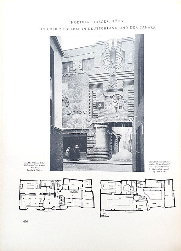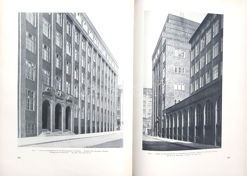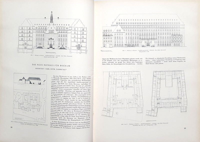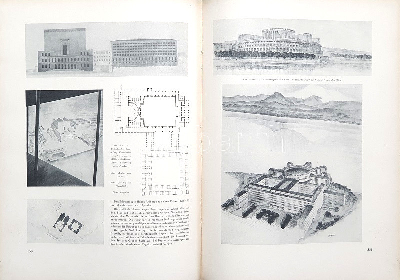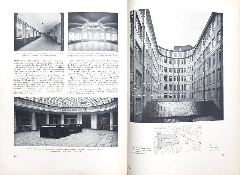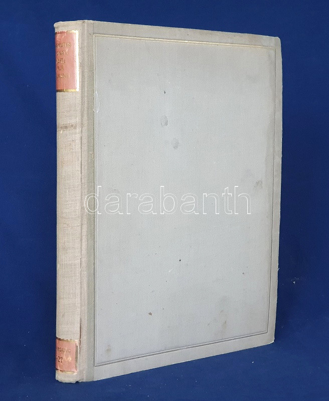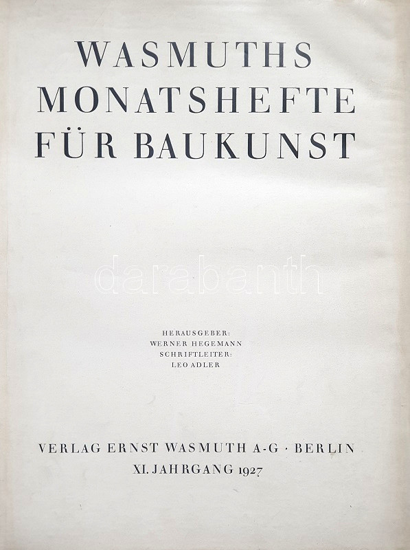 Wasmuths Monatshefte für Baukunst. Herausgegeber: Werner Hegemann. XI. Jahrgang (1927). [Teljes évfolyam, egybekötve.] Berlin, 1927. Verlag Ernst Wasmuth AG. (Druck der Selle-Eysler AG.) [16] + 508 p. Folio. A Werner Hegemann (1881-1936) építész, közíró által szerkesztett képes építészeti folyóirat 1914-1931 között jelent meg, évről évre növekvő urbanisztikai érdeklődéssel. Közírói szerepet is betöltő szerkesztője miatt a folyóirat egyre jobban nyitott az építészet társadalmi kérdései felé, Werner Hegemann a folyóirat szerkesztőjeként az építészeti szecesszió és historizmus kíméletlen ellenfele, az építményi díszítmények éles kritikusa és a letisztult formák kedvelője volt; építészeti értelemben egyaránt érdeklődött a modernizmus előfutárának tekinthető, dísztelen monumentalitást sugalló neoklasszicizmus és a kisebb léptékű építményekben gondolkodó, funkcionalista Bauhaus iránt. Folyóirat-évfolyamunk változatos szerzőgárdájának szakcikkeit oldalszámozáson belül igen gazdag szövegközti fotóanyag, építészeti rajzanyag kíséri. A cikkek érdeklődése elsősorban a középületekre irányul: iskolák, városházák, közigazgatási intézmények, gyárépületek, irodaépületek, társasházak tervanyagai között tallózhatunk a folyóiratszámokban. A fotóanyagon jól nyomon követhető a szerkesztőség szenvedélyes érdeklődése a négyszögletes formák, a szimmetria, a társadalmi tervezés és olykor a monumentalitás iránt. Az építészeti folyóirat elsősorban német anyagot közöl, de feltűnnek a lapszámban Prága, Varsó, Stockholm, Amszterdam, Rotterdam egyes modernista épületei is, hazánkból az ipari modernizmus nagyszerű példáját, a Quitter Ernő által tervezett ferencvárosi Hazai Fésűsfonó és Szövőgyár épületeit hozza. A kötet több tanulmánya foglalkozik a Népszövetség genfi palotájának terveivel, a monumentalitásában is elképesztő (ám végül íróasztalfiókban maradt) épületterveket számos rajzban megcsodálhatjuk. Évfolyamunk méltatja továbbá a brémai kortárs téglaépítészet valódi kuriózumát, az afrikai hatásokat mutató Paula Modersohn-házat. Aranyozott kiadói egészvászon kötésben. Jó példány.