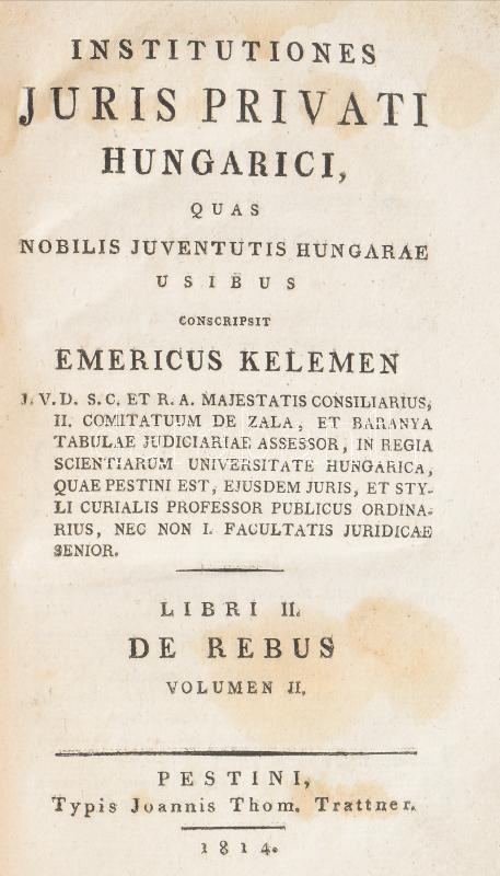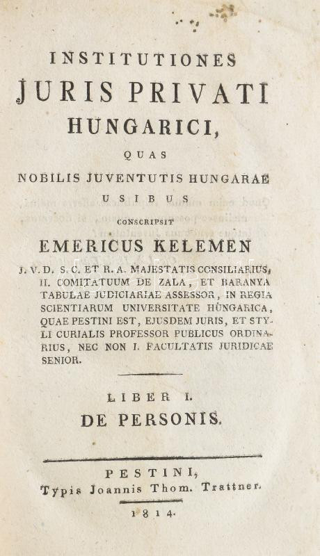 [Kelemen Imre (1745-1819)] Emericus Kelemen: Institutiones juris privati Hungarici, quas nobilis juventutis Hungariae usibus conscripsit Emericus Kelemen. [Magyar hazai polgári magános törvényről írt tanítások.] Liber I-III. Liber I.: De Personis. Liber II. Volumen I-II.: De Rebus. Liber III.: De Actionibus. Pestini, 1814, Typis Joannis Thom. Trattner, 1 (szerző portréja, rézmetszetű címkép) t. + XVI + 516 p.+ 2 (kihajtható tábla) t.; 2+[523]-1027+5 p.+1 (rézmetszetű térkép) t.+2+[1031]-1294+4 p.; 410+8 p. Az I. és II. kötetek 1., a III. kötet 2. kiadás. Latin nyelven. Hozzá tartozik: Historia juris hungarici privati, documentis, ac testimoniis illustrata, quam elucubratus est nobilis hungarus zaladiensis - -. Budae, 1818, Typis Regiae Scientiarum Univer. Hungariae, 1 (szerző portréja, rézmetszetű címkép) t. + VII+1+512+14 p. Latin nyelven. Egyetlen kiadás! Egységes átkötött modern félvászon-kötés, a gerincen aranyozott felirattal és számozással, foltos lapokkal, az I. kötet címképe sérült, a felső sarkán kis hiánnyal, a címlapon kis lyukkal, a címlapot követő lap (III/IV) sarkán hiánnyal, a II. kötet utolsó lapján és a hátsó szennylapon lyukkal, a III. kötet címlapján bélyegzésekkel.