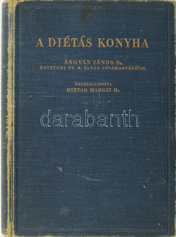 Ángyán János - D.-né Mittag Margit: A diétás konyha a mindennapos gyakorlatban. Dr. Ángyán János egyetemi ny. r. tanár jóváhagyásával a Pécsi Erzsébet Tudományegyetem Belklinikájának gyakorlata alapján összeáll. D.-né Mittag Margit a belklinika diétás tanársegédje. I.: A szív, a vérkeringés és a vese megbetegedéseinek étrendje. II.: A gyomor-, bél-, máj- és epehólyagbetegségek étrendi ellátása. III.: A lázas megbetegedések, a tuberkulózis, a vészes vérszegénység, a Bazedow-kór és az idült székrekedés étrendje, soványító és hízlaló étrend. IV.: A cukorbetegek étrendje. Bp.,(1933.),Singer és Wolfner Kiadói aranyozott egészvászon-kötés, a gerincen és borítón kopásnyomokkal, előzéklapon kisebb folttal, kissé laza kötéssel.