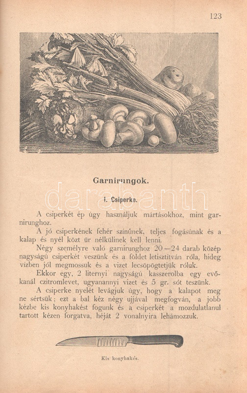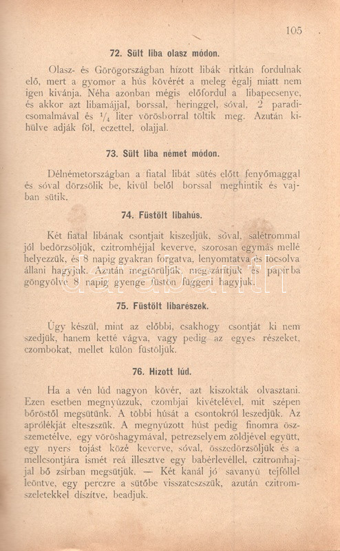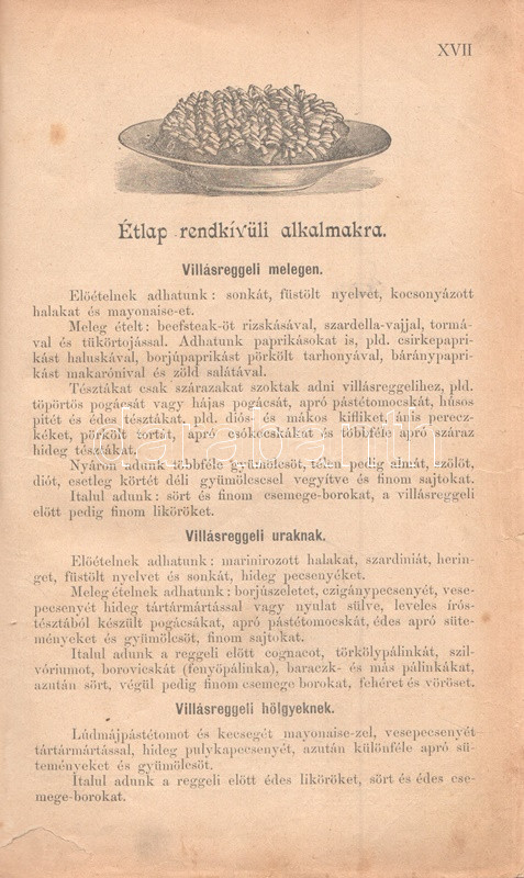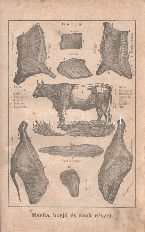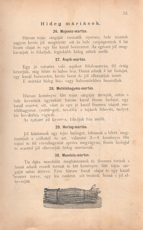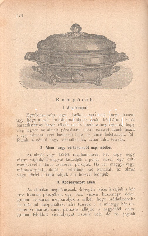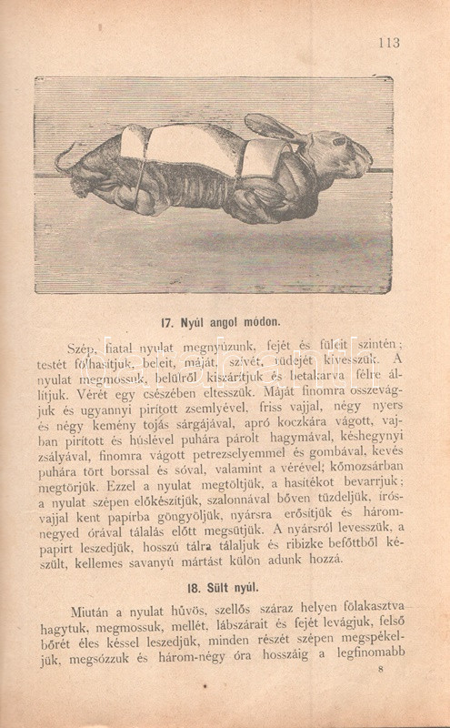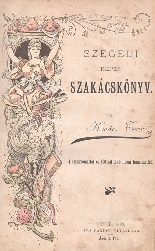 Kovács Teréz: Szegedi képes szakácskönyv. 4 színnyomattal és 100-nál több finom fametszettel. Szeged, 1890. Bába Sándor tulajdona (ny. n.) III-XX + 372 p. + 6 t. (négy színes kőnyomat, egy kétoldalas). Első kiadás. Az 1850-ben született Kovács Teréz kifőzőnő a híres szegedi Rézi nénik, szegedi szakácsnők számát gyarapítja (Szekula Teréz, Doleskó Teréz). Szegedi képes szakácskönyve oldalszámozáson belül gazdag illusztrációs anyaggal büszkélkedhet, magyaros receptanyagában pedig olykor kölcsönvesz korábbi szegedi forrásokból is, mint ez a műfajban szokásos. Példányunkból a címlevél és a belív első nyomtatott levele hiányzik, helyettük két tábla szerepel: a marhaszeldelésről, és a magyar konyhában sokáig vasszörnynek nevezett takaréktűzhelyről; utóbbi verzóján konyhai eszközök illusztrációja. A címképnek beillő két táblán kisebb javítások, pótlások, a belív számos oldalán apró, halvány foltosság, egyes leveleken apró szakadásnyom, két levél sarkán apró, a szövegtükröt nem érintő hiány. Példányunk fűzése az utolsó ív előtt enyhén meglazult. A bekötött eredeti fedőborító színezett. Javított, kötéstábláin pótolt kiadói félvászon kötésben.