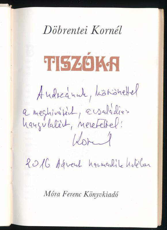 Döbrentei Kornél: Tiszóka. Csáky Lajos rajzaival. A szerző által DEDIK... https://www.darabanth.com/hu/473-Gyorsarveres/473.0/Konyvek/Konyvek-Mesekonyvek-ifjusagi-irodalom~1000047/Dobrentei-Kornel-Tiszoka-Csaky-Lajos-rajzaival-A-szerzo-altal-DEDIKALT-Bp-1986-Mora~II3166273