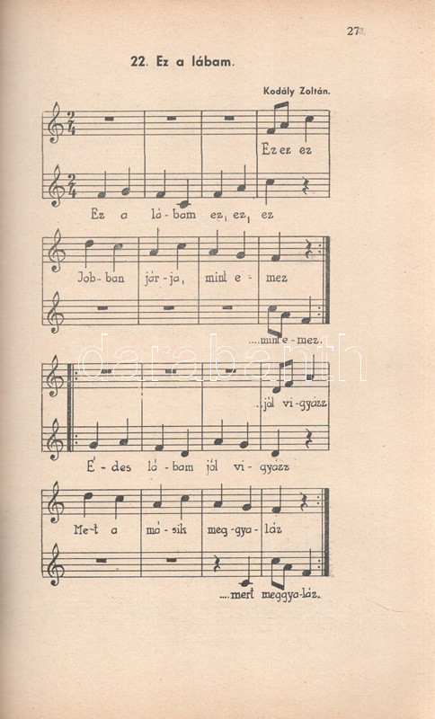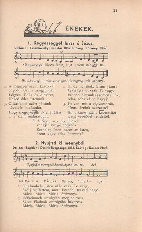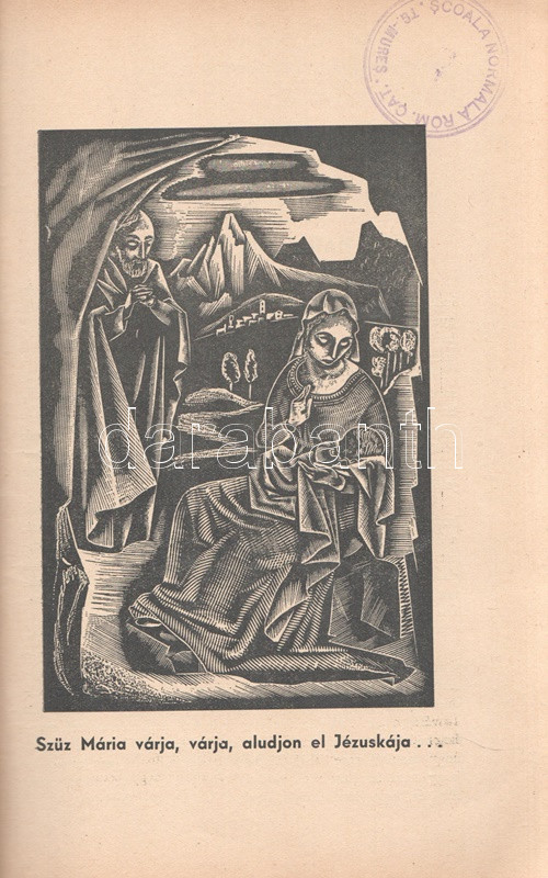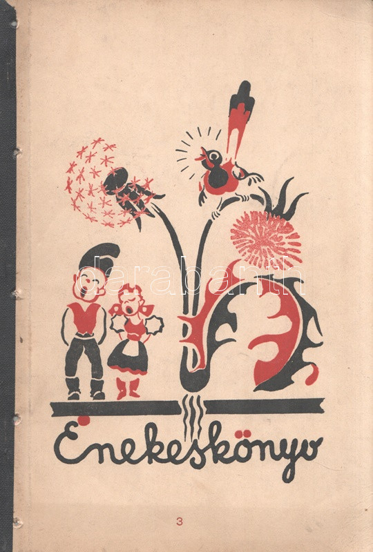 Domokos Pál Péter (összeáll.): Elemi iskolai énekeskönyv a III. osztály részére. (Carte de cantece pentru scolile primare: Clasa III.) (Kolozsvár, 1939). Erdélyi Római Katholikus Tanítói Önsegélyező (Nagy-nyomda, Kolozsvár). 44 p. A gyulafehérvári püspök, Márton Áron által engedélyezett, oldalszámozáson belül szövegközti rajzokkal és kottákkal gazdagon illusztrált, katolikus iskolai énektankönyv népdalokat, gyermekénekeket, hazafias dalokat és szent énekeket tartalmaz, összeállítója az erdélyi román hatóságok által sokat zaklatott Domokos Pál Péter (1901-1992) pedagógus, erdélyi művelődésszervező, néprajzkutató. A harmadik osztály tananyagának elméleti részében már erős helyet foglal Kodály szolmizációs módszere is. A III. osztályos dalanyagban világi részében feltűnik néhány román nyelvű dal is, az egyházi rész viszont kizárólag magyar nyelvű, miként a magyarázó szöveg is. A címoldalon és a belív több oldalán régi gyűjteményi bélyegzés. Monoki 1314. Poss.: Marosvásárhelyi római katolikus elemi iskola könyvtára. Fűzve, színes, illusztrált, enyhén foltos kiadói borítóban. Jó példány.