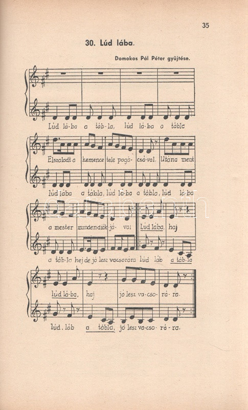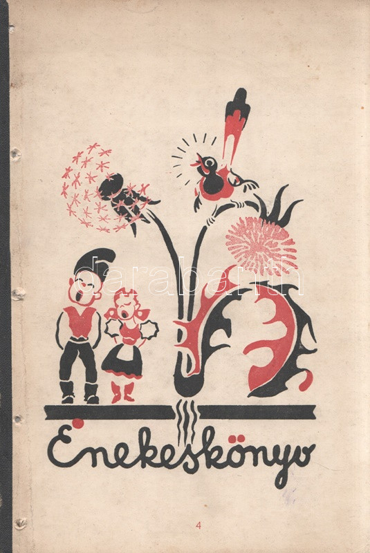 Domokos Pál Péter (összeáll.): Elemi iskolai énekeskönyv a IV. osztály részére. (Carte de cantece pentru scolile primare: Clasa IV.) (Kolozsvár, 1939). Erdélyi Római Katholikus Tanítói Önsegélyező (Nagy-nyomda, Kolozsvár). 43 + [1] p. A gyulafehérvári püspök, Márton Áron által engedélyezett, oldalszámozáson belül szövegközti rajzokkal és kottákkal illusztrált, katolikus iskolai énektankönyv körjátékokat, gyermekénekeket és szent énekeket tartalmaz, összeállítója az erdélyi román hatóságok által sokat zaklatott Domokos Pál Péter (1901-1992) pedagógus, erdélyi művelődésszervező, néprajzkutató. A negyedik osztály tananyagának elméleti része beavat a ritmusképletekbe is, az énekek között pedig már feltűnnek a szerkesztő, Domokos Pál Péter által gyűjtött dalok is. A IV. osztályos dalanyagban világi részében - feltehetően hatalmi utasításra - feltűnik néhány román nyelvű hazafias dal is, az egyházi rész viszont kizárólag magyar nyelvű, miként a magyarázó szöveg is. A román hazafias dalok érdekes ellenpontozásaként az egykori tulajdonos elhelyezte kötetünkben a kortárs katonanóta, az ,,Erdélyi induló" kottáját is; e nyomtatvány aligha születhetett román fennhatóság alatt. A címoldalon és a belív több oldalán régi gyűjteményi bélyegzés. Monoki 1314. Poss.: Marosvásárhelyi római katolikus elemi iskola könyvtára. Fűzve, színes, illusztrált, enyhén foltos kiadói borítóban. Jó példány.