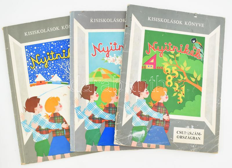 Nyitnikék. Kisiskolások könyve. I-II. félév (1-2. köt.) Szerk.: Huszár Tiborné. Bp., 1986, Közgazdasági és Jogi Könyvkiadó. Kiadói sérült papÃrkötés + Nyitnikék 3. Csupaszám országban. Szerk. Huszár Tiborné. Rajzolta: Kepes Erzsébet. Kisiskolások könyve. Bp.,1976, RTV-Minerva, (Offset-ny.), sérült papÃrkötés. Firkákkal.