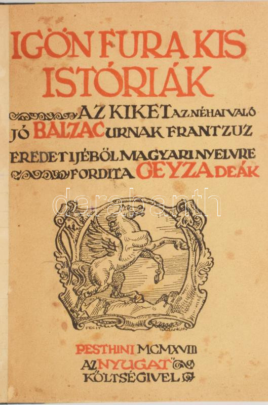 Balzas, Honoré de: Igön fura kis istóriák az kiket az néhai való jó Balzac urnak frantzuz erdetijéből magyar nyelvre fordita: Geyza Deák Pest, 1918. Nyugat. 97 + (1) p. Amatőr félvászon kötésben