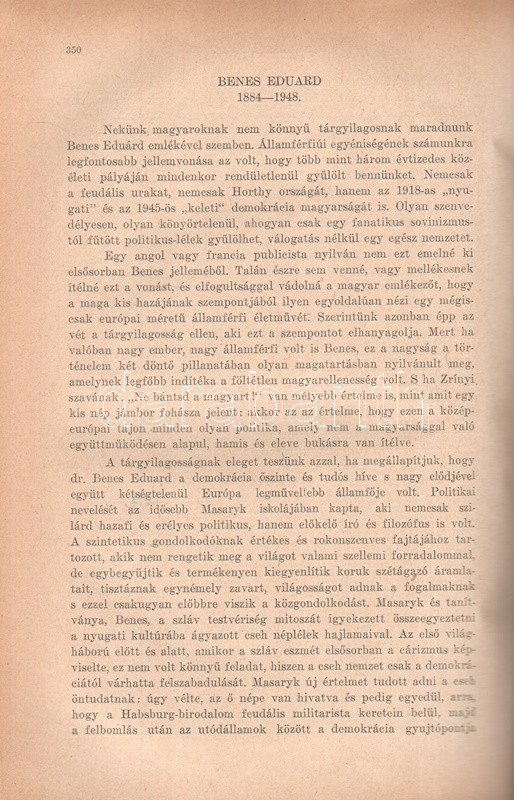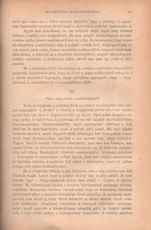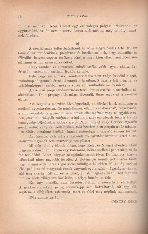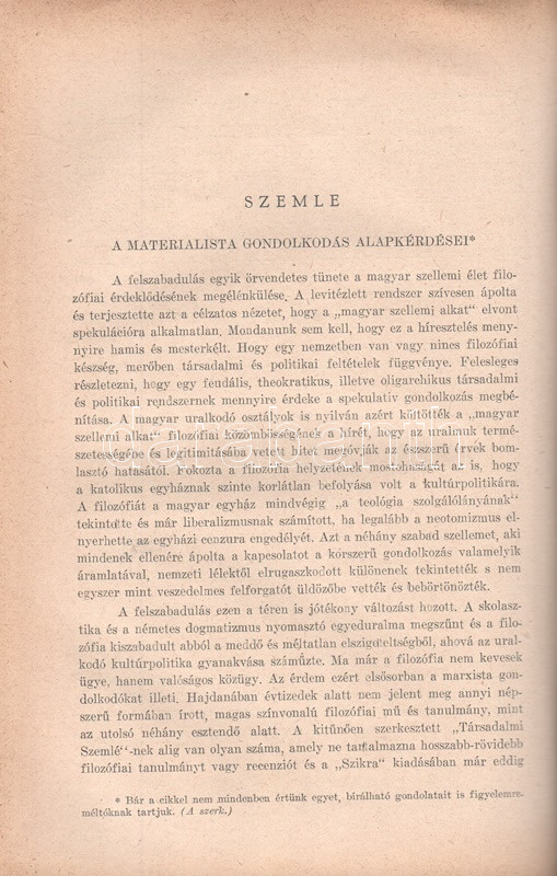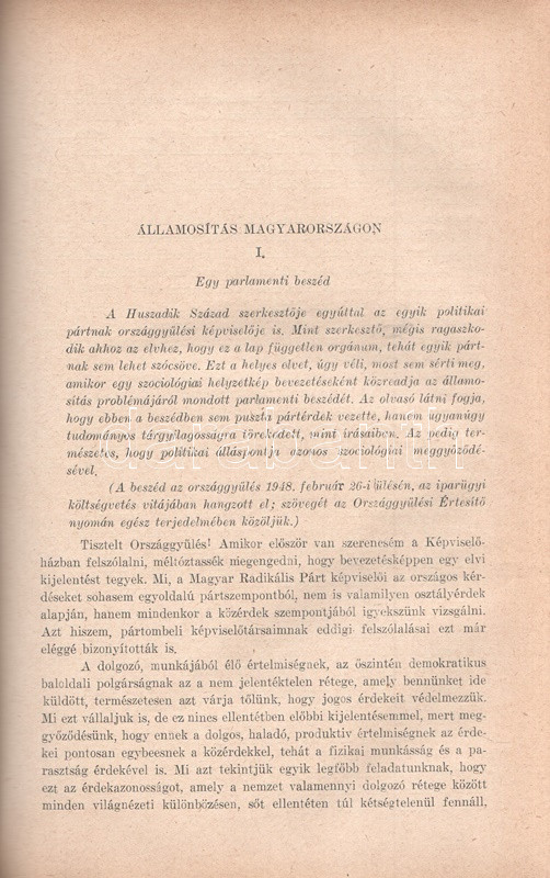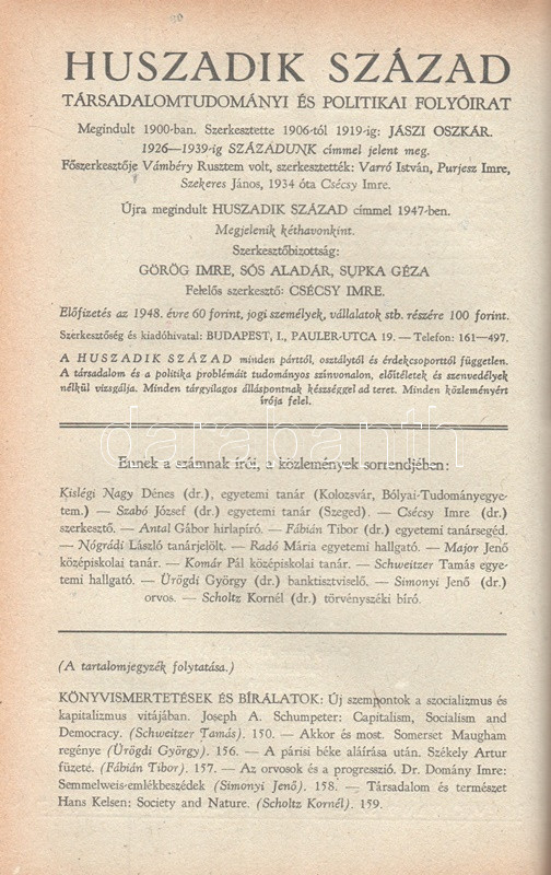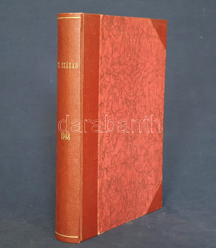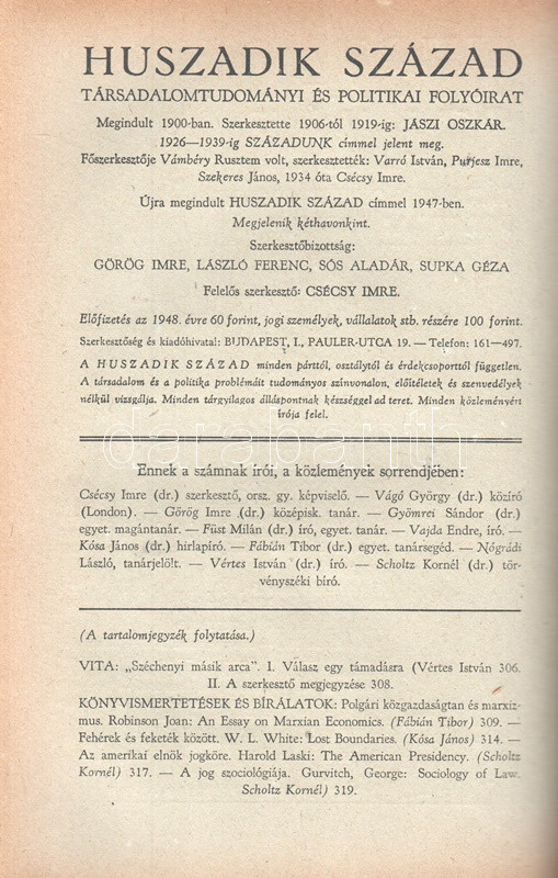 [Folyóirat] Huszadik Század. Társadalomtudományi és politikai folyóirat. Szerkeszti Csécsy Imre. Megjelenik kéthavonkint. 36. évfolyam, 1-6. szám. (1948) [Egybekötve.] Budapest, 1948. Társadalomtudományi Társaság (Antiqua Rt. ny.) 1 t. (címkép) + 4 + 480 p. A Huszadik Század társadalomtudományi folyóirat a múlt század meghatározó szociológiai folyóirata volt, 1900-1919 között polgári radikális szellemben Jászi Oszkár szerkesztette. A lap 1926-1939 között, névváltoztatás után Századunk címmel jelent meg, előbb Vámbéry Rusztem, majd 1934-től Csécsy Imre szerkesztésében. Az 1947-ben ismételten Huszadik Század néven meginduló folyóirat összesen három évfolyamot ért meg, a felálló diktatúra ugyanis nem tűrte meg a társadalomtudományi diszciplínát a maga polgári radikális szellemében. A lap évente öt-hat alkalommal jelentkezett, 80 oldalas terjedelemben, szociológiai, politológiai, szabadságjogi és politikai filozófiai cikkekkel. A Csécsy Imre (1893-1961) polgári radikális politikus, képviselő és publicista által szerkesztett lapszámok mérsékelten baloldali szerzői a kommunista fordulat évében olykor igen jelentős bátorságról tettek tanúbizonyságot, mikor kiálltak a többpárti demokrácia elvei és a vélemények sokfélesége mellett. E nemben emlékezetes, amikor a szabadságharc századik évfordulójának alkalmából egyaránt teret engedtek a Széchenyi István személyéről írt magasztaló és kritikai szellemű írásnak, illetve teljes egészében közölték Csécsy Imrének az államosítás gyakorlata ellen mondott parlamenti beszédét, amellyel a szerző és szerkesztő aligha szerzett elismerést az uralomra törő radikális baloldal politikusainál. Az év előrehaladásával a lap tudomásul vette a Marshall-terv visszautasítását, illetve szemlézte brit kommunista véleményformálók Sztálinról alkotott véleményét, ám mindezek ellenére viszonylagos politikai bátorságról tesz tanúbizonyságot Csécsy Imre szerkesztő néhány defenzívába szorult, mégis erős sora: ,,Azt kérjük a marxista ideológusoktól, ne törekedjenek mindenáron szellemi egyeduralomra. Ne minősítsenek ellenforradalmárnak, reakciósnak, a munkásosztály és a szocializmus konok ellenségének vagy a legjobb esetben elavult ideológiák rabjának mindenkit, aki nem Hegelt tekinti a világ legnagyobb bölcsének, s jobban szeret Platón, Kant vagy Bergson nyelvén gondolkodni. Vagy aki irodalomban, művészetben nem csupán a társadalomhoz között tartalmat értékeli, hanem elsősorban a teremtő egyéni formát". A tartalomból: Éber Ernő: Kossuth és a jobbágy-felszabadítás - Csécsy Imre: Harmadik út vagy Népfront? - Kislégi Nagy Dénes: Durkheim a demokráciáról - Csécsy Imre: Államosítás Magyarországon. Egy parlamenti beszéd. Polgári önvizsgálat. Van-e még jövője a polgárságnak? - A kétarcú Széchenyi. Kun Zsigmond és Vértes István írása - Szegő Iván: A materialista gondolkodás alapkérdései - Csécsy Imre: Politika és humánum - Vágó György: Jeremy Bentham - Görög Imre: A Marshall-terv - Csécsy Imre: Benes Eduard [kritikai] nekrológja. Aranyozott gerincű korabeli félvászon kötésben, az eredeti fedőborítók bekötve. Jó példány.