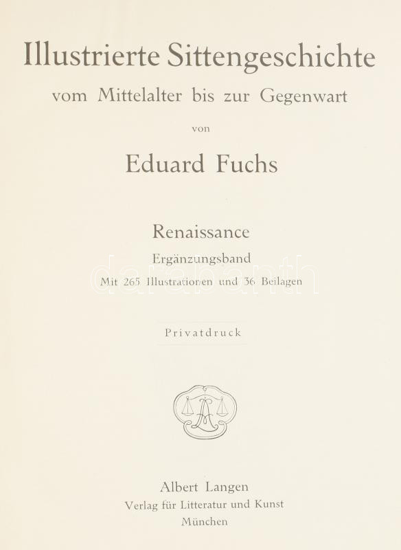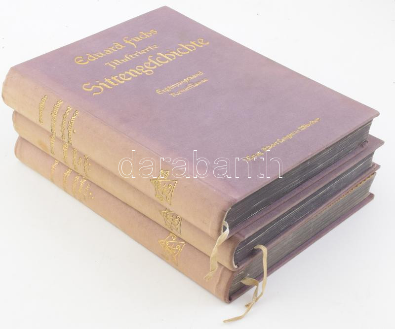 Fuchs, Eduard: Illustrierte Sittengeschichte vom Mittelalter bis zur Gegenwart. I-III. köt. [Teljes]. I.: Renaissance. II.: Die galante Zeit. III.: Das bürgerliche Zeitalter. München, [1909-1912], Albert Langen. Rendkívül gazdag fekete-fehér képanyaggal illusztrálva. Német nyelven. Kiadói aranyozott bársonykötés, jó állapotban, kissé fakó gerinccel.