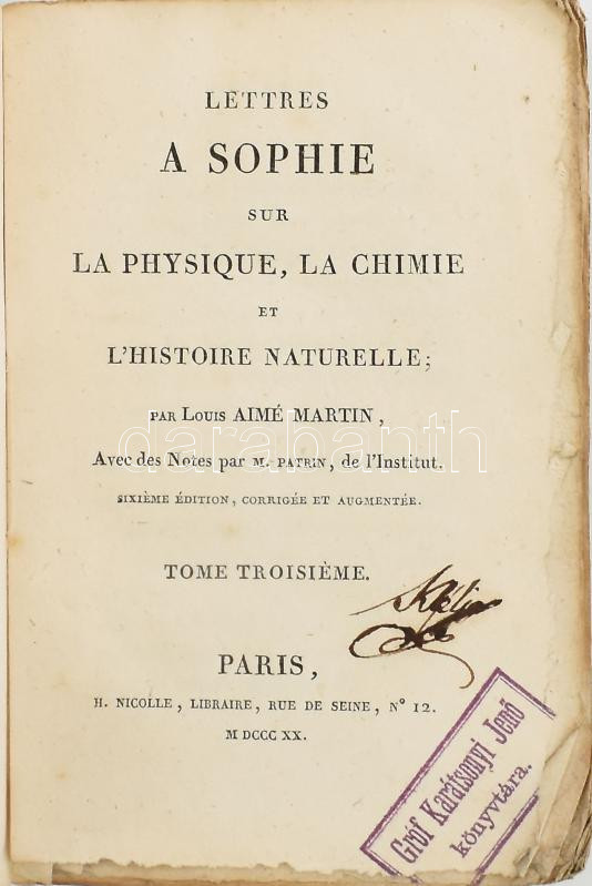 Lettres A Sophie sur la Phisique, La chimie et L'histoire naturel... https://www.darabanth.com/hu/473-Gyorsarveres/473.0/Konyvek/Konyvek-Termeszettudomany-medicina~1000025/Lettres-A-Sophie-sur-la-Phisique-La-chimie-et-Lhistoire-naturelle-Paris-1820I-II-Papirbori~II3204808