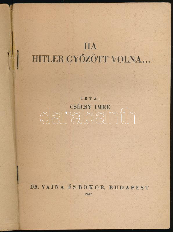 Csécsy Imre: Ha Hitler győzött volna... Bp., 1946, Dr. Vajna és Bokor.... https://www.darabanth.com/hu/473-Gyorsarveres/473.0/Konyvek/Konyvek-Tortenelem~1000040/Csecsy-Imre-Ha-Hitler-gyozott-volna-Bp-1946-Dr-Vajna-es-Bokor-48-p-Kiadoi-papirkotC3~II3209967