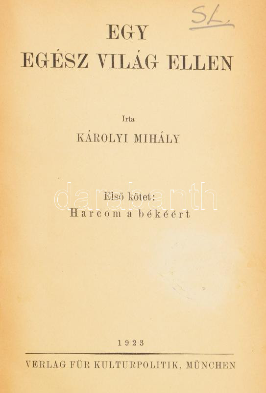 Károlyi Mihály: Egy egész világ ellen. I. köt.: Harcom a békéért. München, 1923, Verlag für Kulturpolitik, 498+IX+(1) p. Unicus! Első magyar nyelvű, emigrációs kiadás. Átkötött félvászon-kötésben, kissé kopottas borítóval, sérült gerinccel, néhány kissé sérült lappal, két lap kijár.