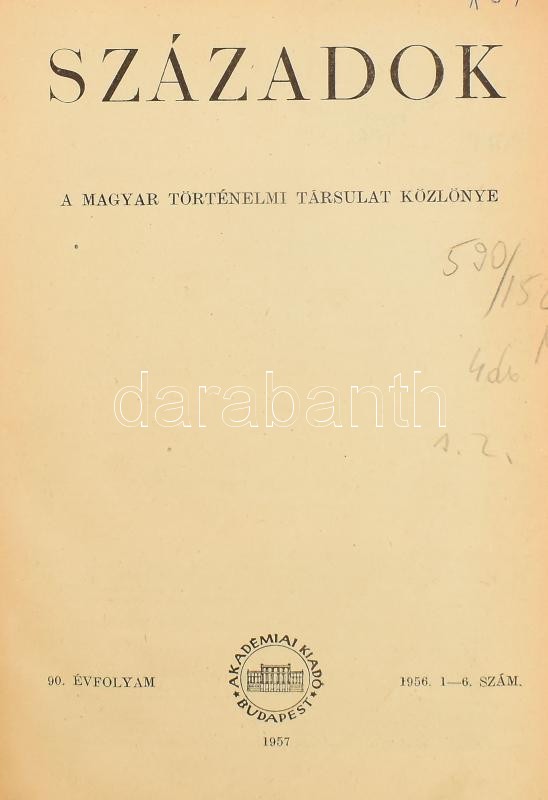 Leírás: Századok. A Magyar Történelmi Társulat közlönye. 90. évf. 1956. 1-6. sz. Bp., 1957, Akadémiai Kiadó. Félvászon-kötésben, intézményi bélyegzőkkel.