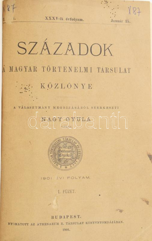 Századok. A Magyar Történelmi Társulat közlönye. Szerk.: Nagy Gyula. 1901. évi (XXXV.) évf. 1-10. füzet. (Teljes évfolyam egy kötetben). Bp., 1901, Magyar Történelmi Társulat (Athenaeum-ny.), 1062 p.+ A Magyar Történelmi Társulat névkönyve, 2 sztl. lev.+ 83 p. Félvászon-kötésben, nagyrészt jó állapotban, intézményi bélyegzőkkel.