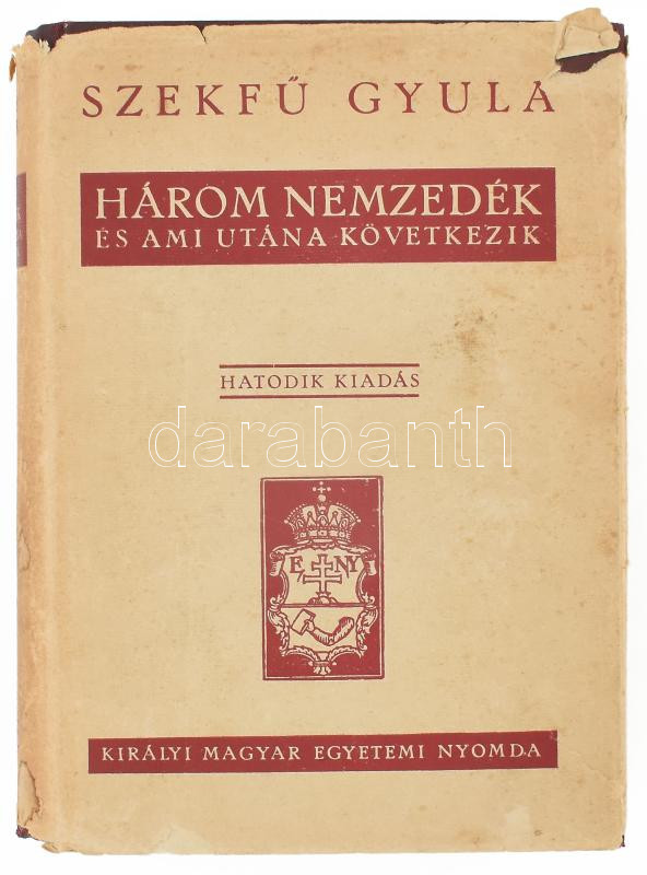 Szekfű Gyula: Három nemzedék és ami utána következik. Bp., 1940, Kir. M. Egyetemi Nyomda, 514 p. Kiadói aranyozott egészvászon-kötés, nagyrészt jó állapotban, sérült kiadói papír védőborítóban.