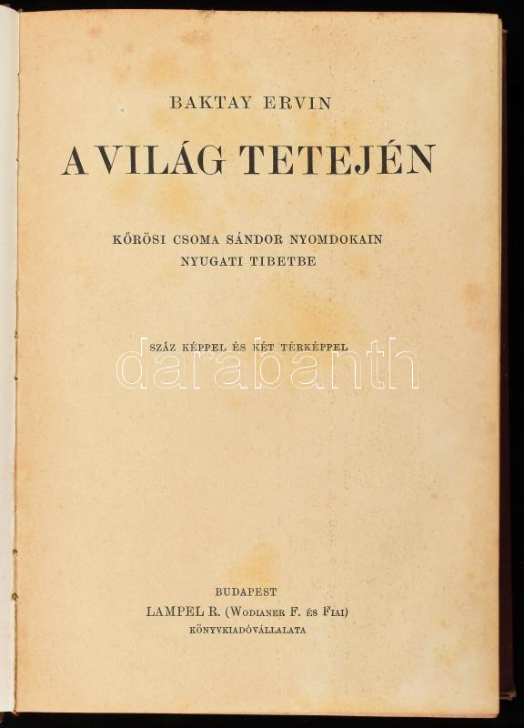 Baktay Ervin: A világ tetején. Kőrösi Csoma Sándor nyomdokain Nyugati Tibetbe. Száz képpel és két térképpel. A Magyar Földrajzi Társaság Könyvtára. Bp., Lampel. Kiadói aranyozott egészvászon kötés, kopottas állapotban.