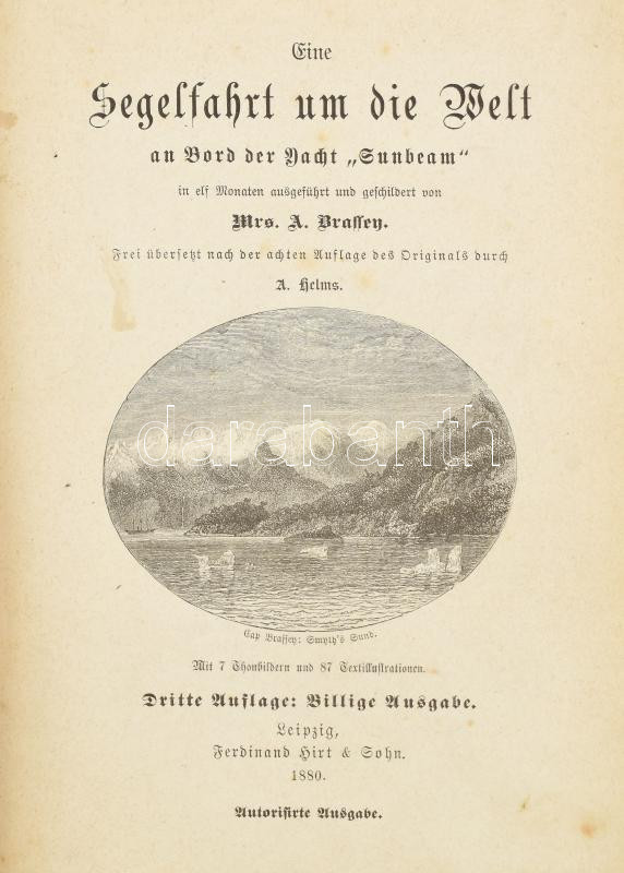 Brassey, [Anna, Baroness Brassey]: Eine Segelfahrt um die Welt an Bord der Yacht ,,Sunbeam" in elf Monaten ausgeführt und geschildert von - - . Frei übersetzt nach der achten Auflage des Originals durch A. Helms. Leipzig, 1880, Ferdinand Hirt & Sohn, VIII+389+(3) p.+ 7 t. Szövegközti és egészoldalas, fekete-fehér illusztrációkkal. Német nyelven. Átkötött félvászon-kötésben, kissé kopottas borítóval, a gerincen kis sérülésekkel, helyenként kissé foltos lapokkal.