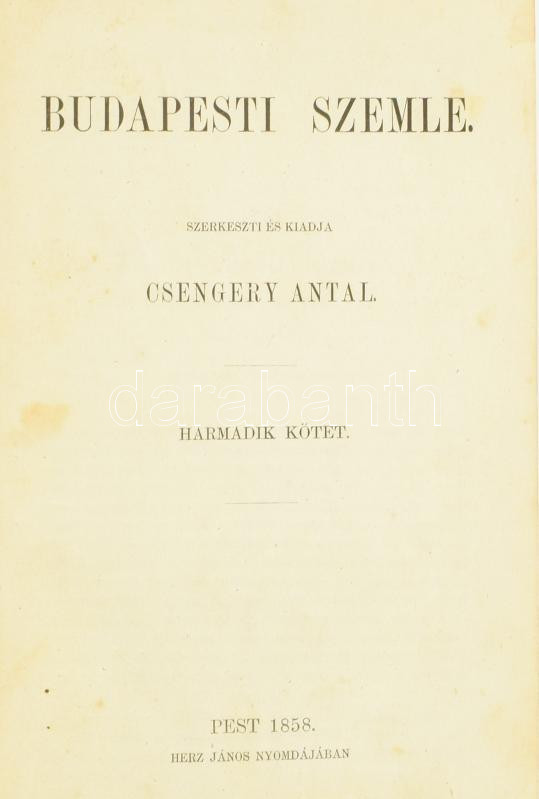 Budapesti Szemle. III. kötet. Szerk. és kiadja: Csengery Antal. Pest, 1858., Herz János, 509+3 p. Korabeli aranyozott gerincű félvászon-kötés, kopott borítóval, foxing foltos lapokkal, ceruzás bejelölésekkel és aláhúzásokkal.