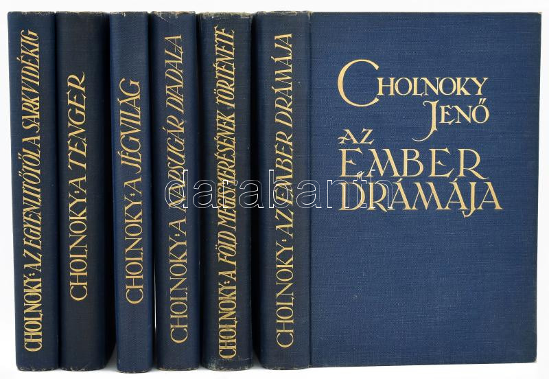 Cholnoky Jenő 6 darab műve a Singer és Wolfner kiadásában: Cholnoky Jenő: A tenger. Bp., 1931, Singer és Wolfner. Kiadói egészvászon kötés + Cholnoky Jenő: Az egyenlítőtől a sarkvidékig. Bp.,1930, Singer és Wolfner. Fekete-fehér fotókkal illusztrált. Kiadói aranyozott egészvászon kötés + Cholnoky Jenő: A jégvilág. A sarkkutatások története. 67 kép és 14 ábra a szövegben. Bp., 1930, Singer és Wolfner. Kissé kopott aranyozott kiadói egészvászon kötésben + Cholnoky Jenő: A napsugár diadala. 107 kép és 67 ábra a szövegben. Bp., 1930, Singer és Wolfner. Kiadói aranyozott egészvászon kötés + Cholnoky Jenő: A Föld megismerésének története. Bp., 1932, Singer és Wolfner. Egészvászon kötés + Cholnoky Jenő: Az ember drámája. 117 kép és 70 ábra a szövegben. Bp., 1930, Singer és Wolfner. Kiadói aranyozott, kissé kopott egészvászon kötésben.