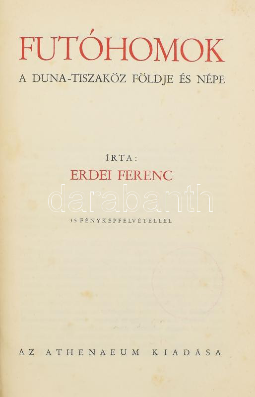 Leírás: Erdei Ferenc: Futóhomok. A Duna-Tiszaköz földje és népe. Bp., Athenaeum. Kiadói egészvászon kötés, kissé kopottas állapotban.